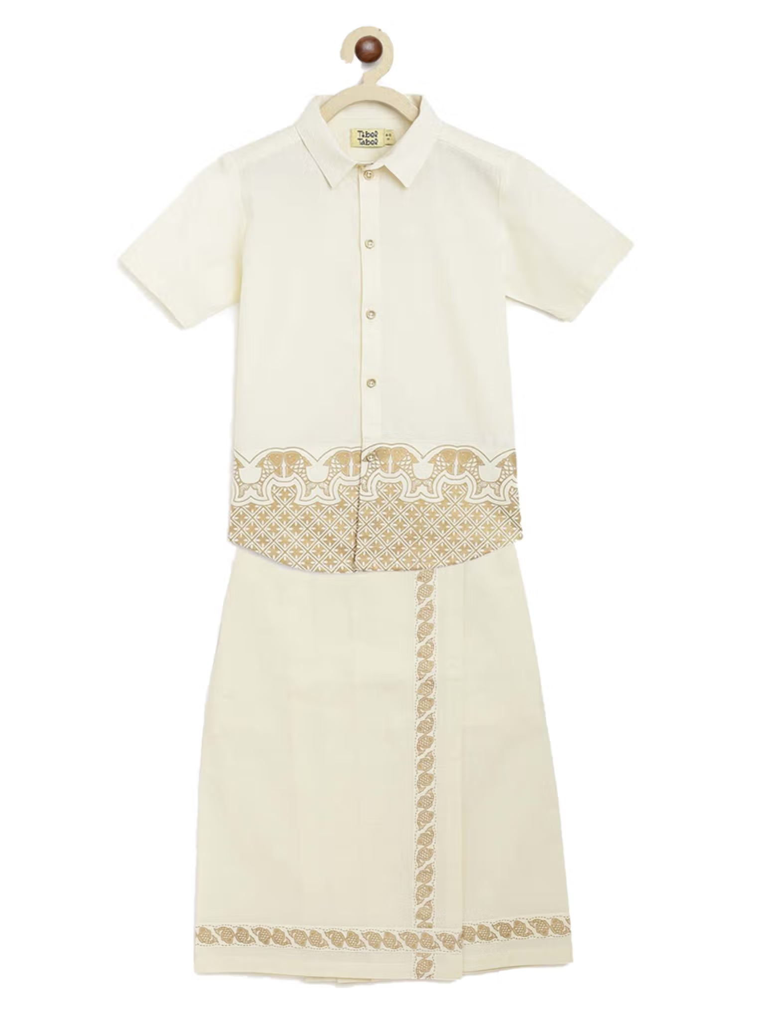 The boys mundu dhoti set Canada stands out for its elegant off white color. It suits weddings, religious events, or family photos. The unique pattern gives a festive look. Both shirt and dhoti are easy to wear. Parents find the dressing simple. Kids move freely without discomfort.