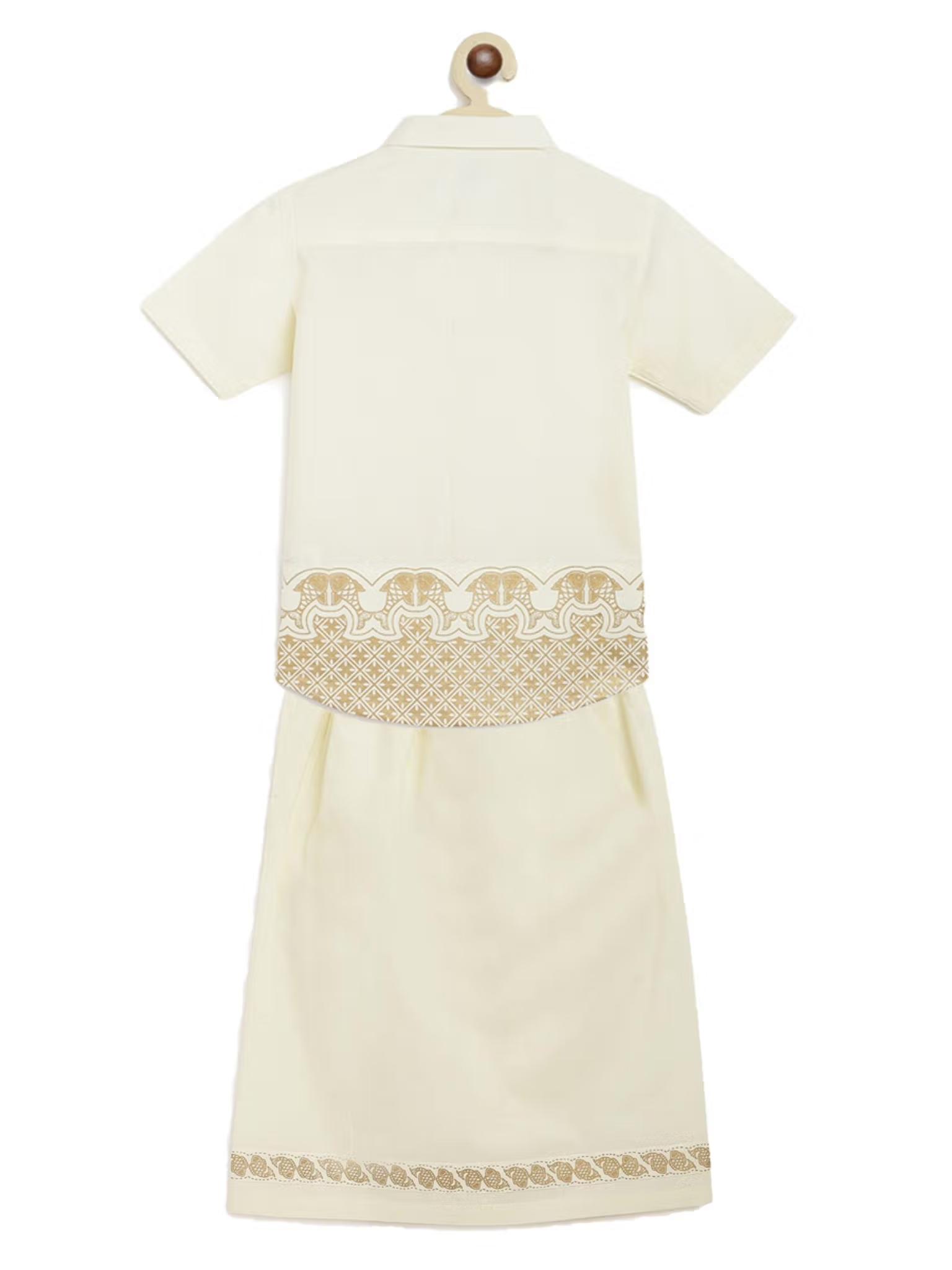 The Boys Mundu Dhoti Shirt - Off White (Set of 2) brings tradition and comfort together. This boys mundu dhoti set Canada makes any celebration special. The soft fabric feels gentle on the skin. The shirt part has a classic collar with buttons. The dhoti comes with gold print details. Your child will feel at ease all day.