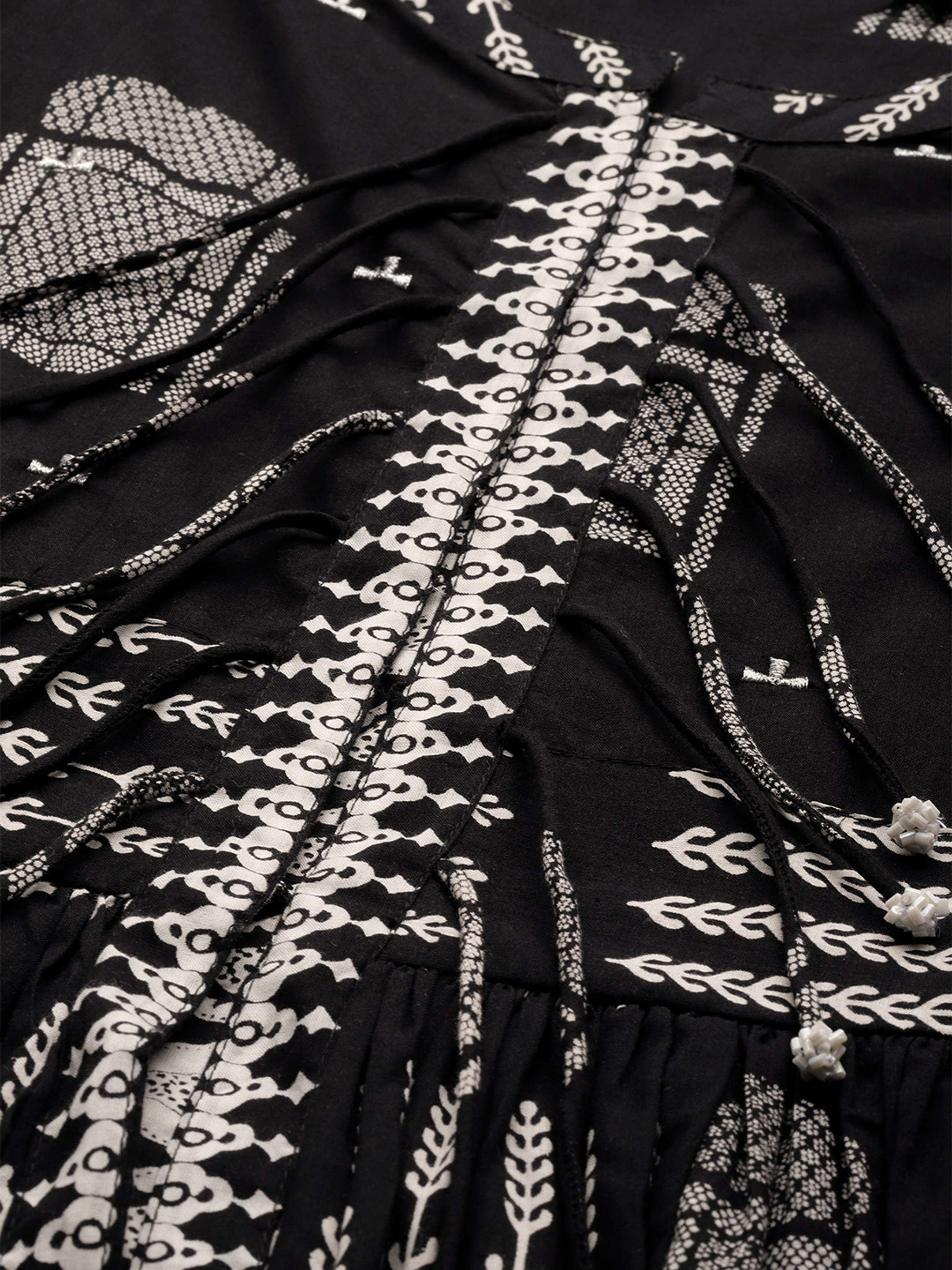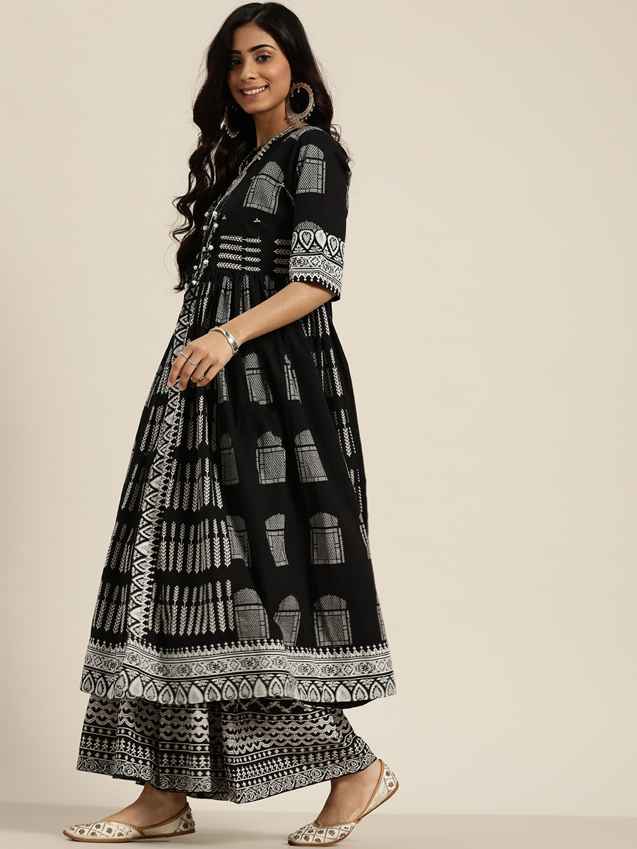 Explore elegance with our Women Black & White Ethnic Motifs Printed Pure Cotton Kurta with Sharara. This captivating ensemble showcases a beautiful blend of traditional and contemporary designs. The black floral cotton kurta set features intricate ethnic motifs that add a unique charm to your look. Crafted from pure cotton, it ensures maximum comfort and breathability, making it perfect for any occasion.