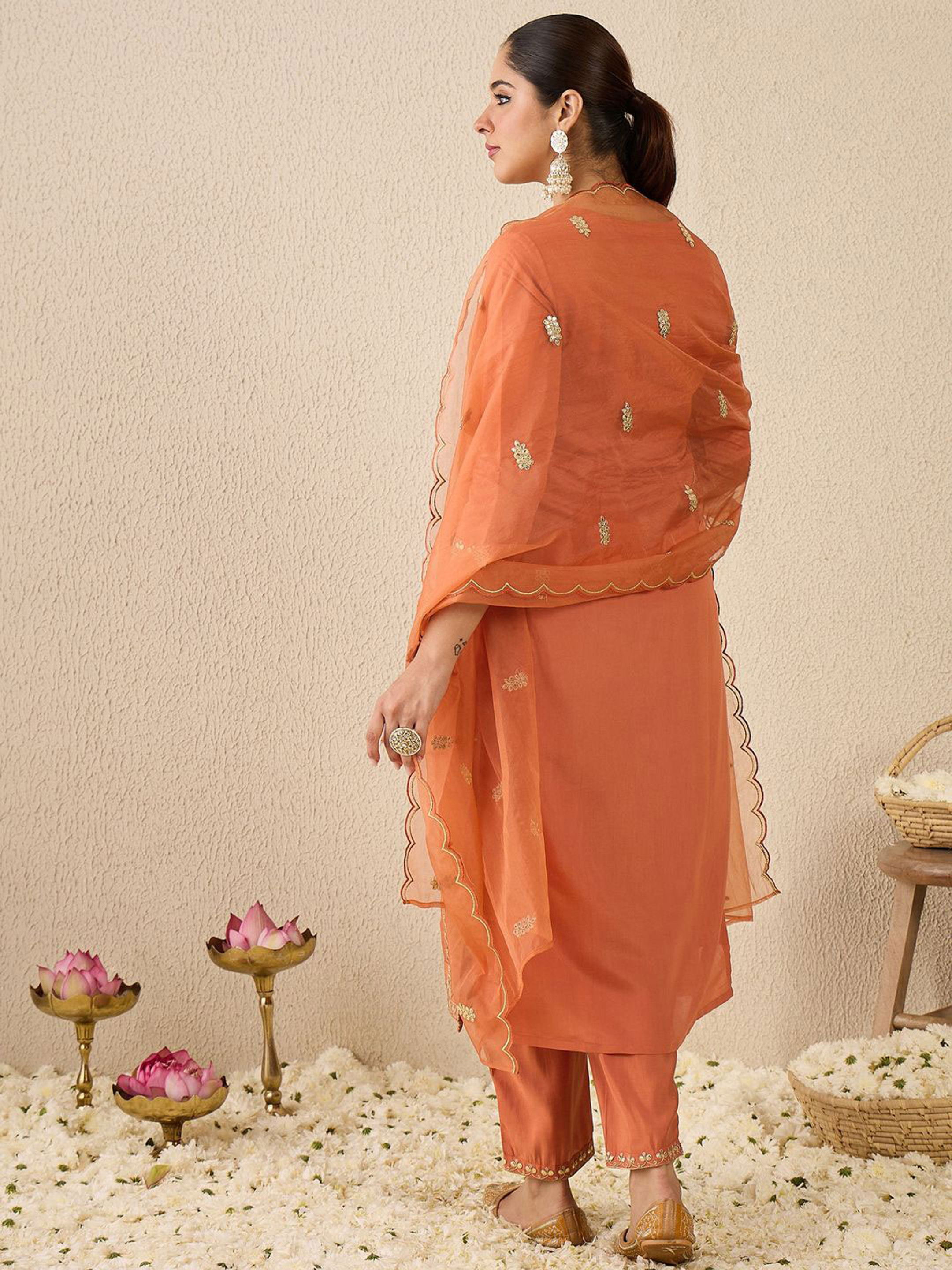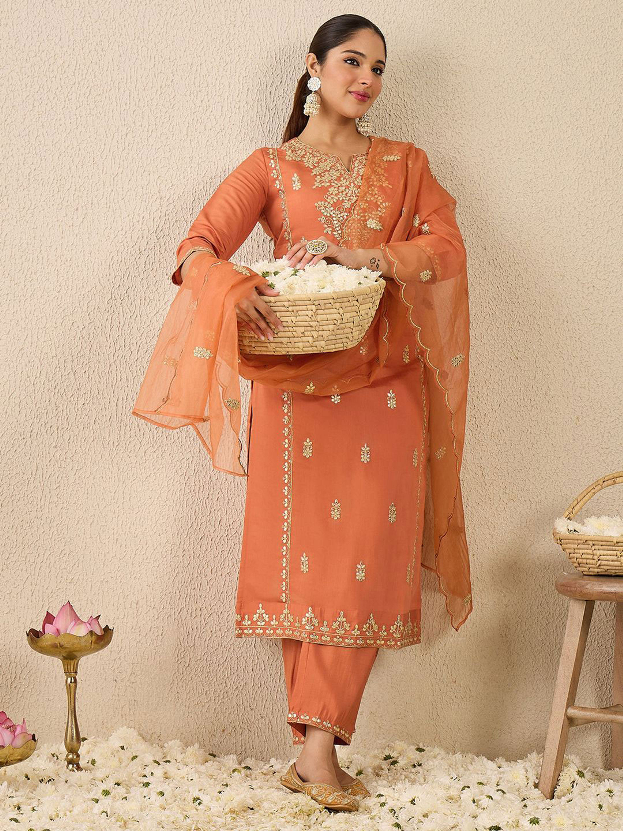 The beautiful straight kurta features a rich orange hue, accented by detailed thread work that captures attention. The matching trousers are designed for a perfect fit, allowing for ease of movement. Plus, the included dupatta adds an extra layer of sophistication, making this ensemble a versatile choice.