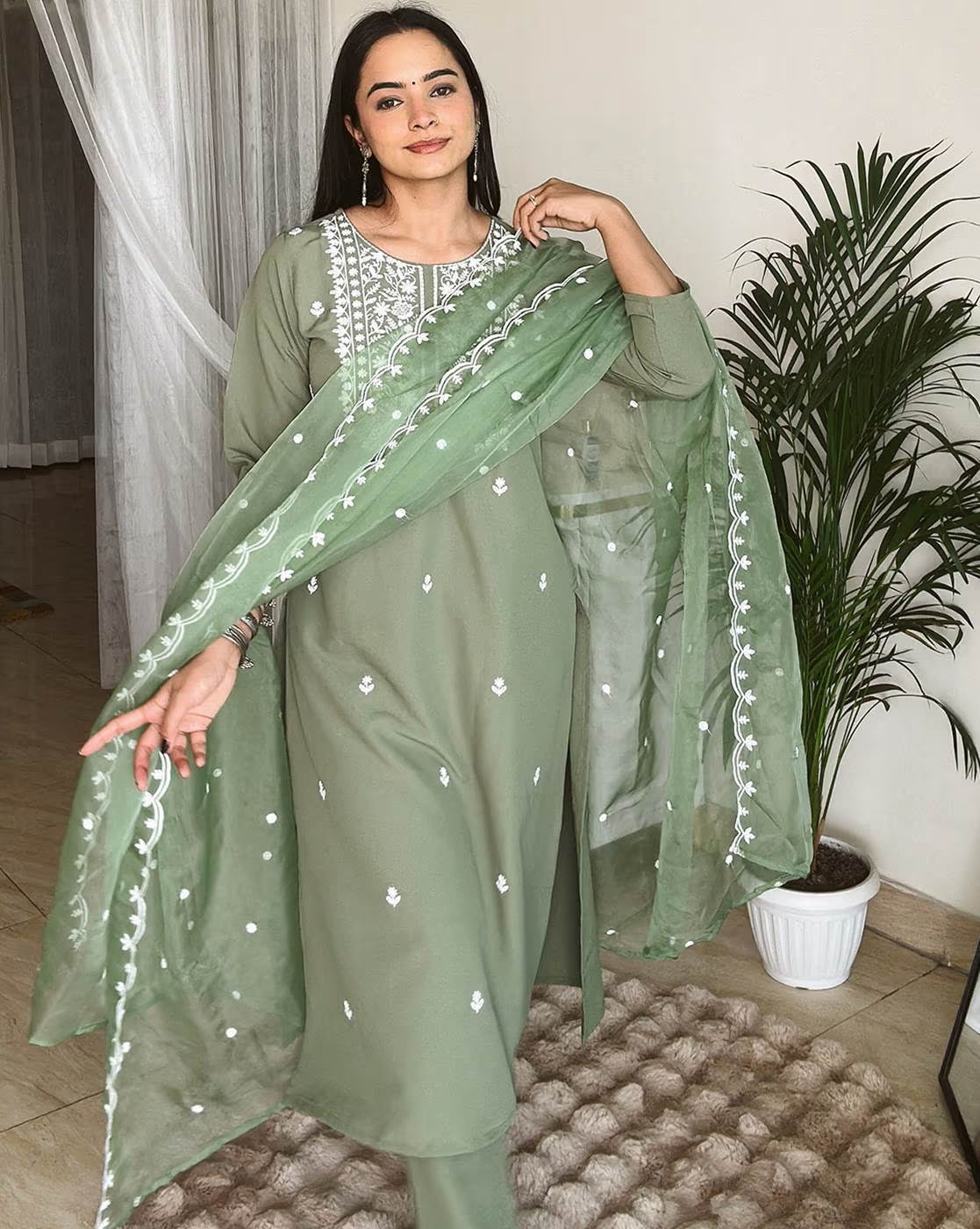 Available in a beautiful green shade, this outfit is perfect for various occasions. Whether you're attending a festival, a family gathering, or a casual outing, this set will help you stand out. The length of the kurta is ideal, providing a comfortable fit that flatters all body types. The accompanying dupatta adds an extra layer of grace, making it versatile for any event.