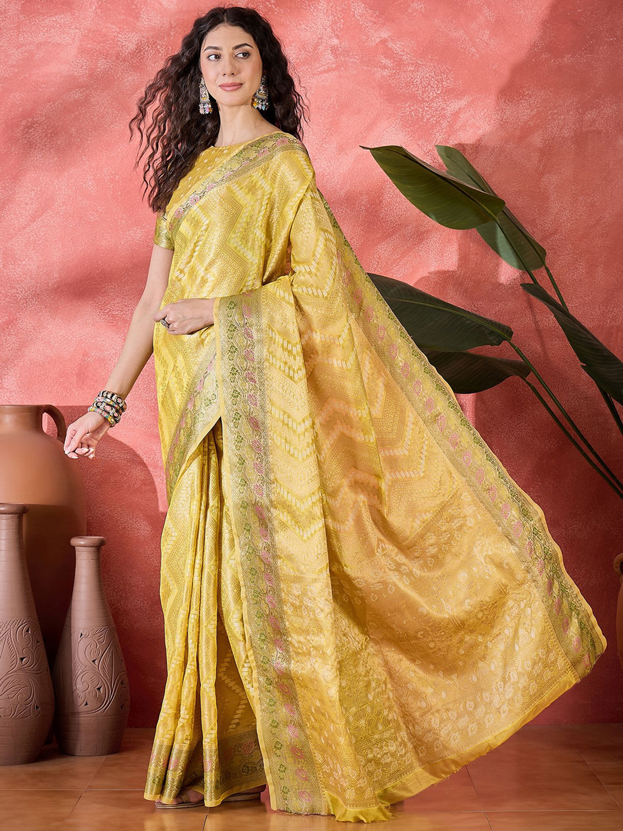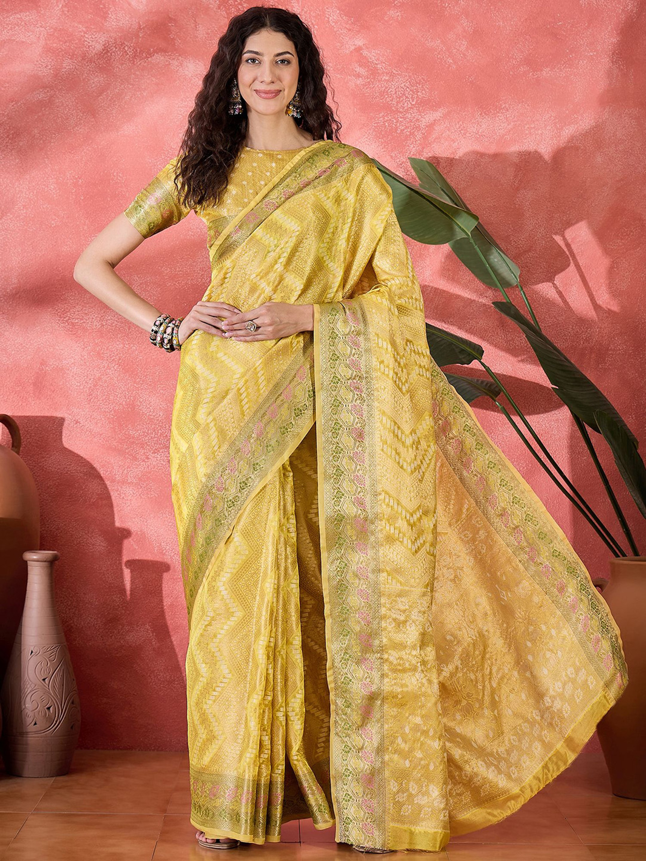 The saree features intricate ethnic motif woven detailing complemented by a classic zari woven border, adding richness and traditional charm. The vibrant yellow tone enhances the zari accents beautifully, making it ideal for weddings, festive functions, haldi ceremonies, and cultural gatherings.