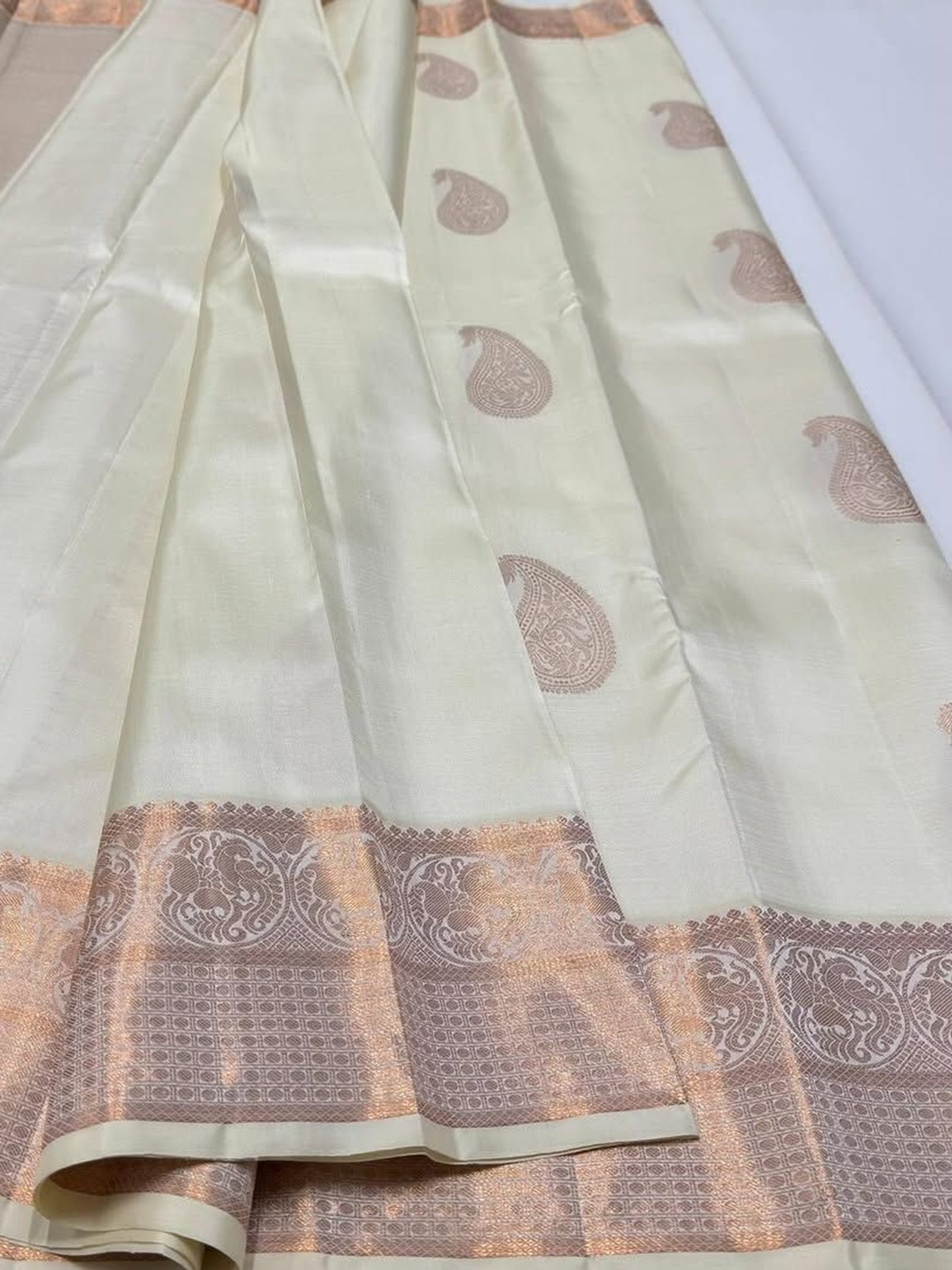 The delicate cream base enhances the brilliance of the zari ornamentation, while the classic woven design border adds structure and festive richness. Perfect for weddings, receptions, temple ceremonies, and grand celebrations, this saree blends timeless artistry with refined sophistication.