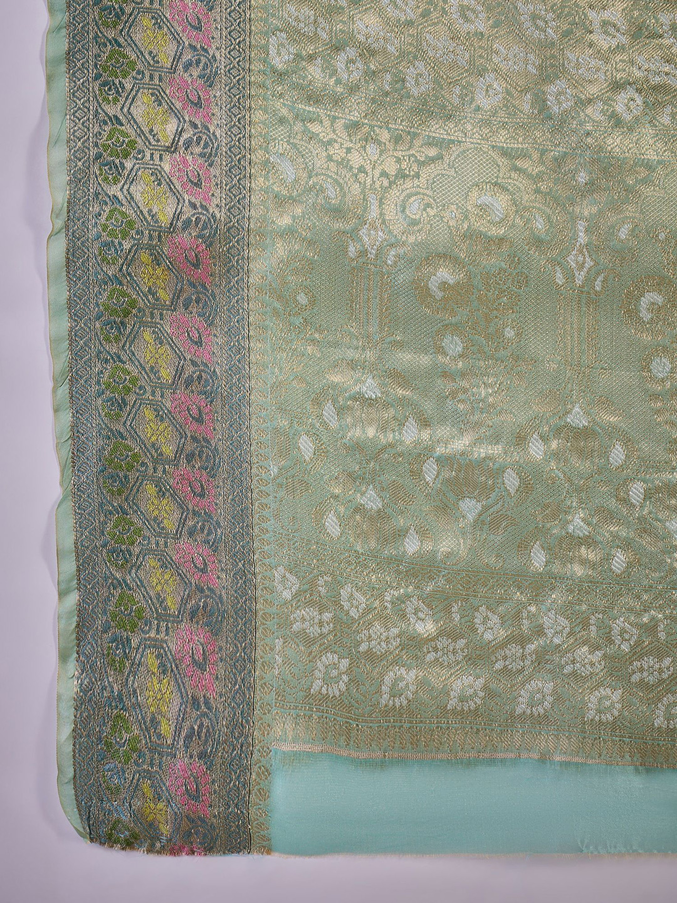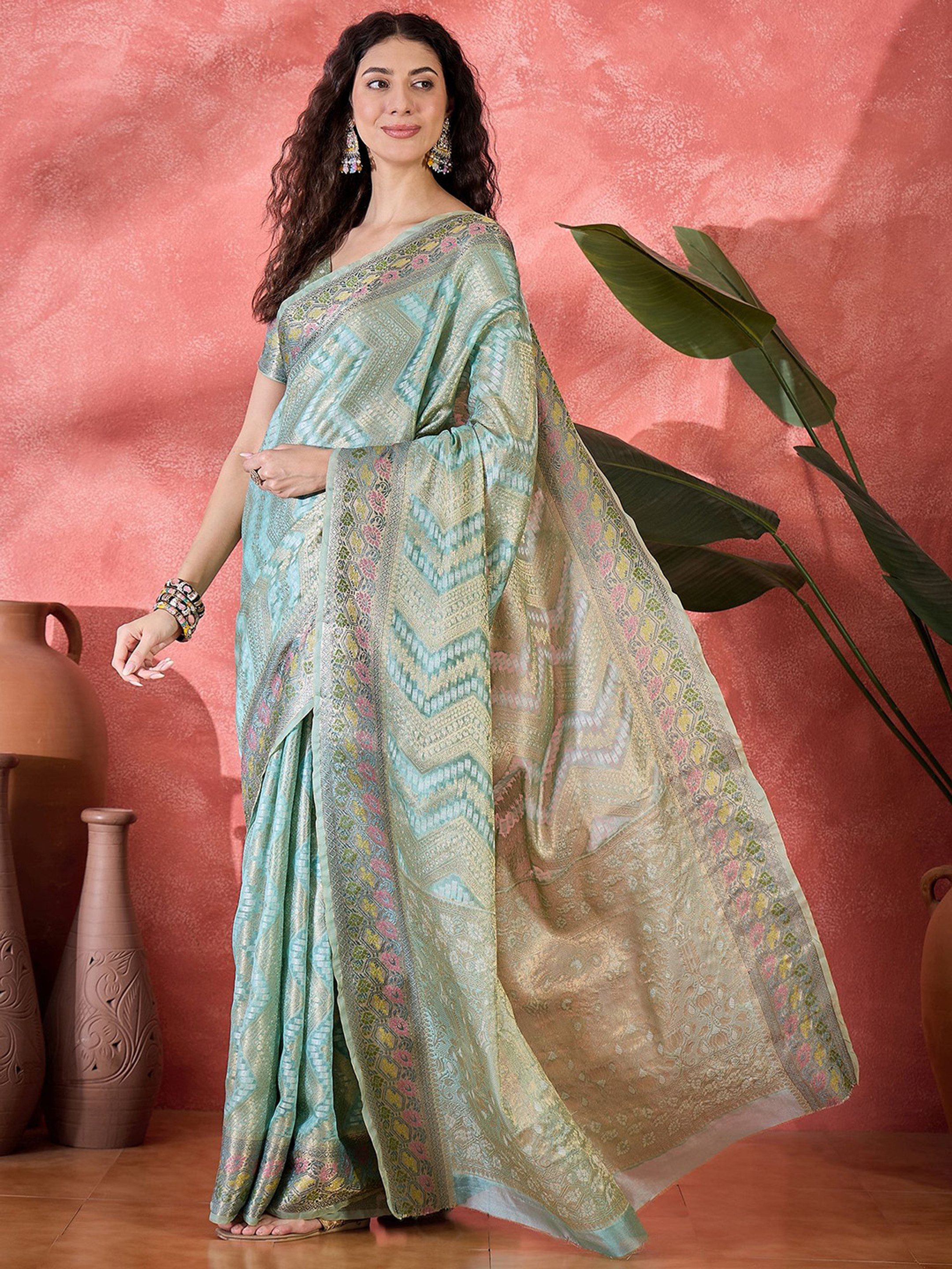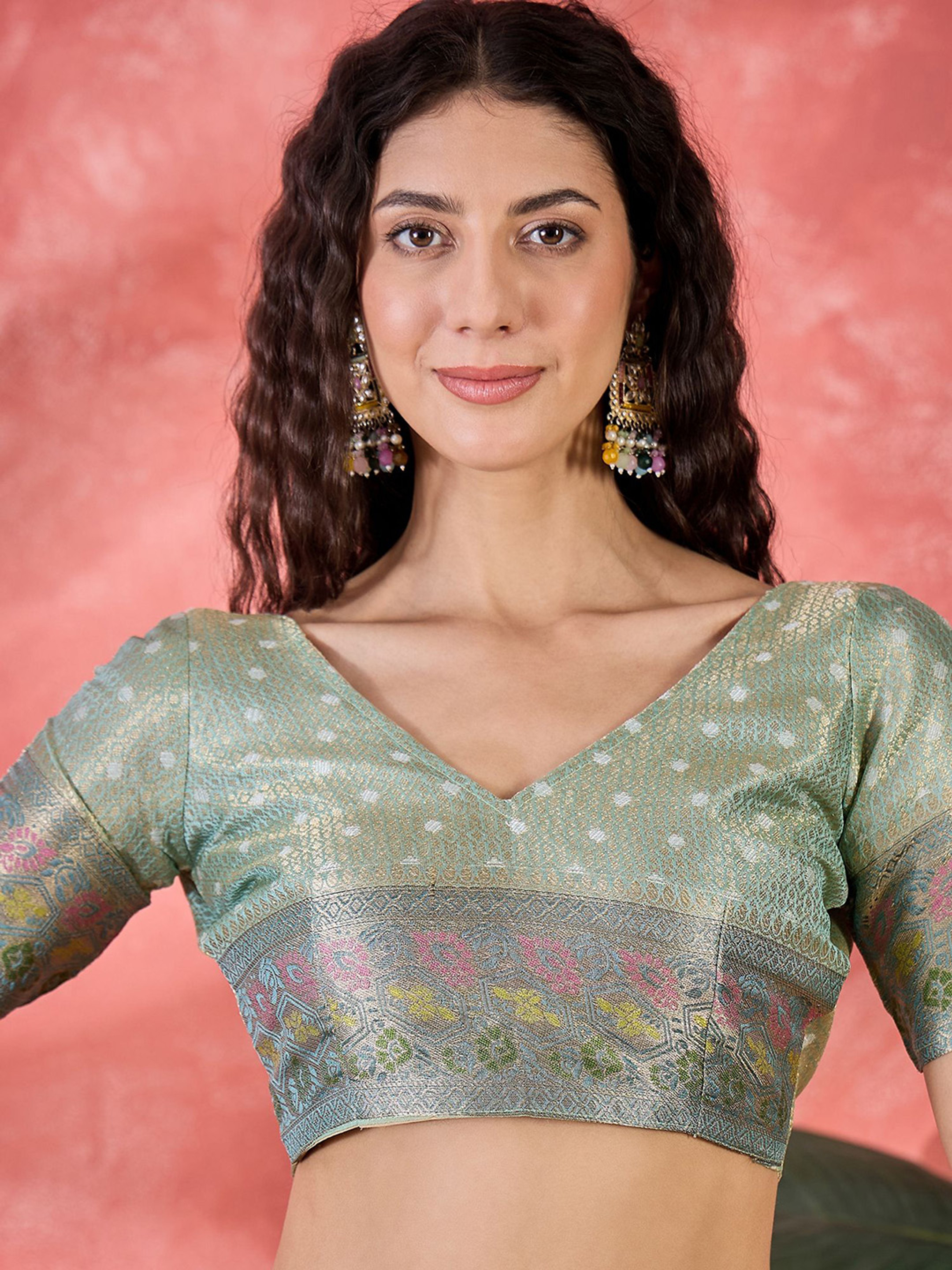 The saree comes with a matching unstitched silk blend blouse piece (0.8 m), allowing you to customize the blouse design and fit according to your style preference.