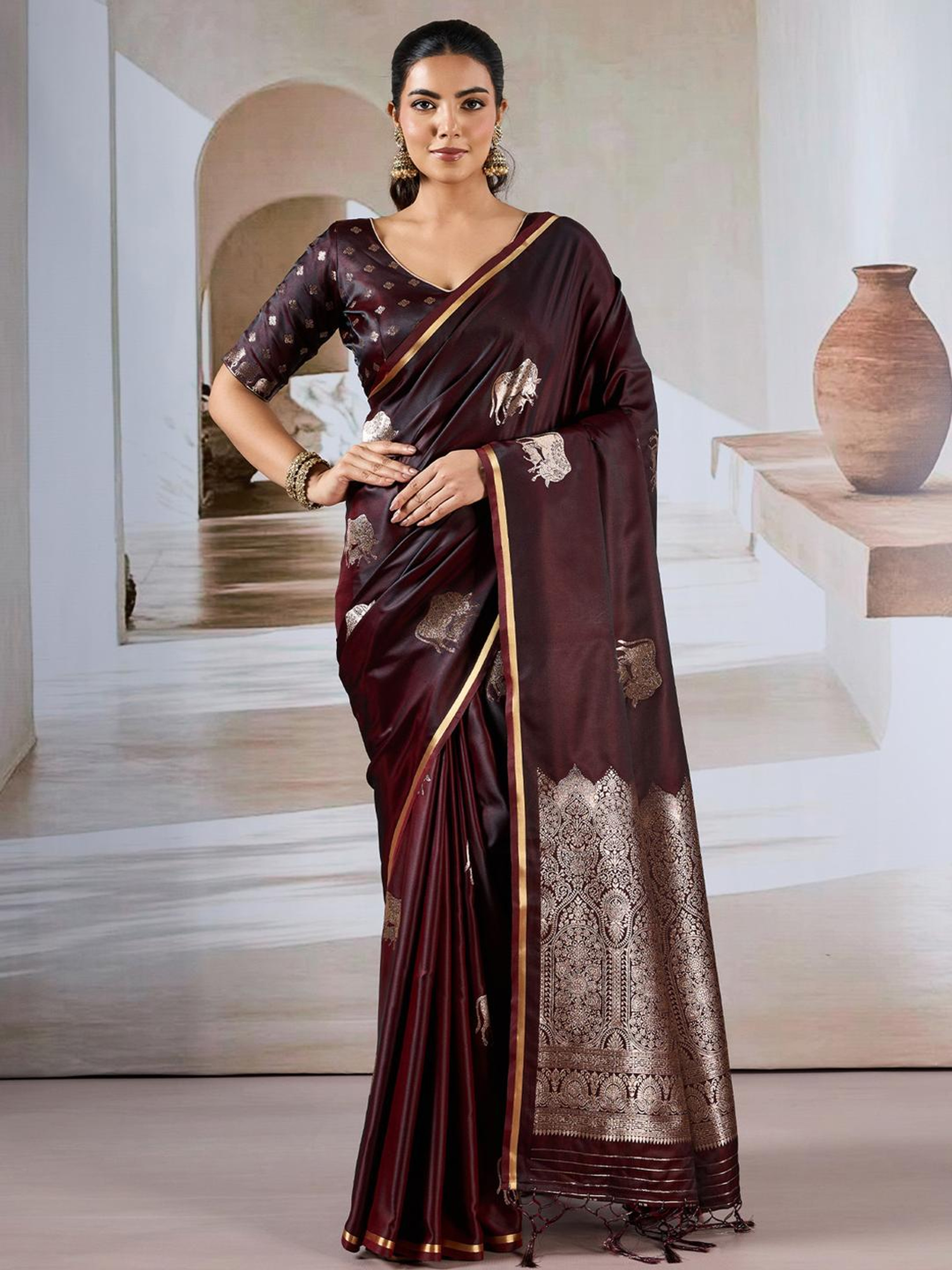 Maroon Banarasi Satin Saree with Ethnic Motif Weave & Zari Border