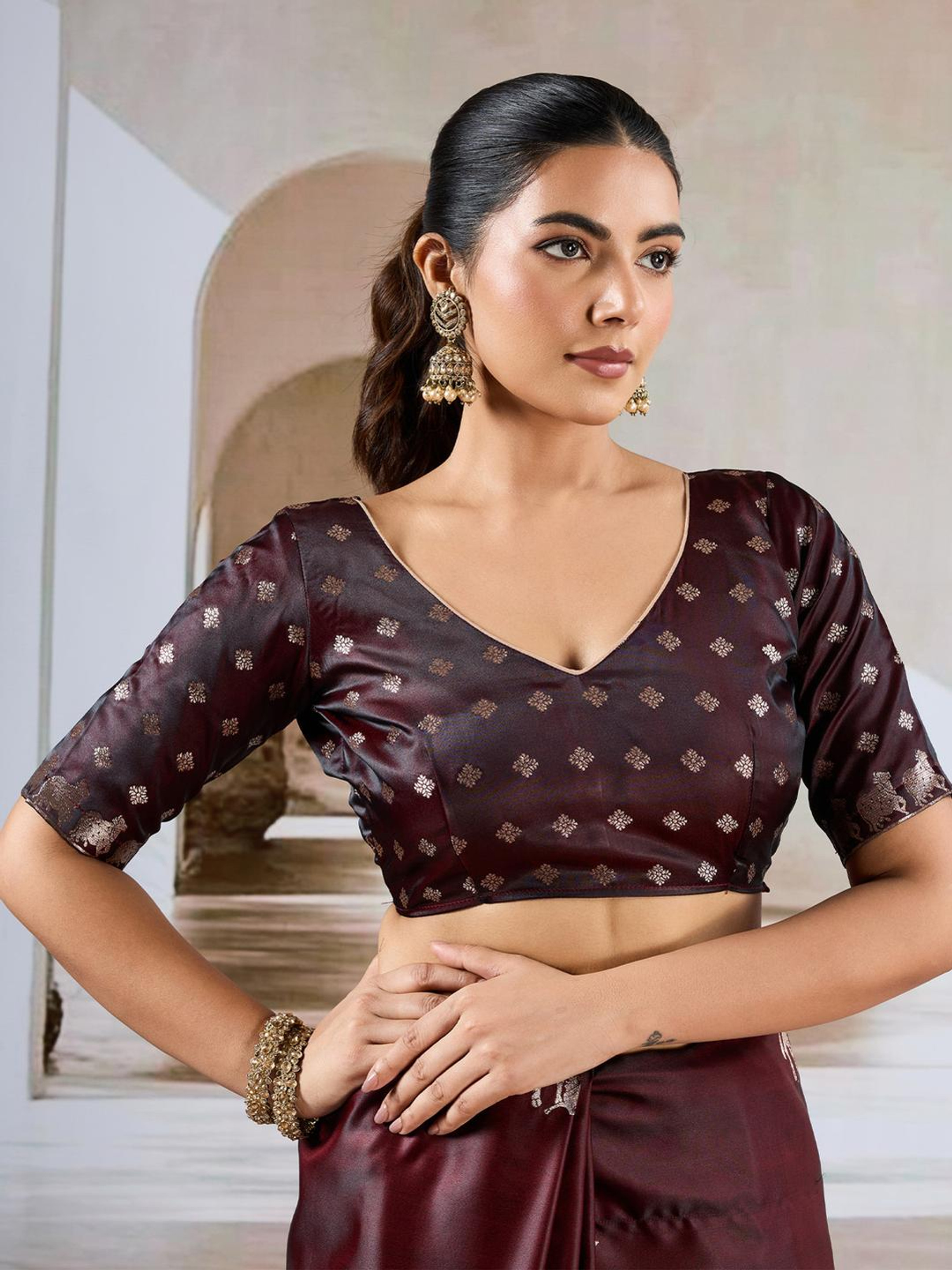Make a timeless statement in this rich maroon Banarasi saree, crafted in lustrous Banarasi satin for a smooth drape and elegant shine. Designed with traditional ethnic motif woven detailing, the saree is finished with a classic zari border that adds festive richness and heritage charm.