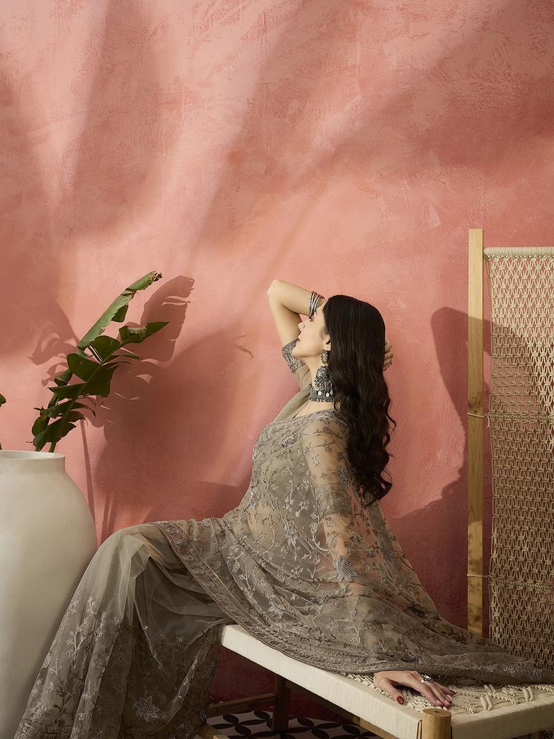 Beige Floral Embroidered Net Saree with Lace Border & Blouse Piece