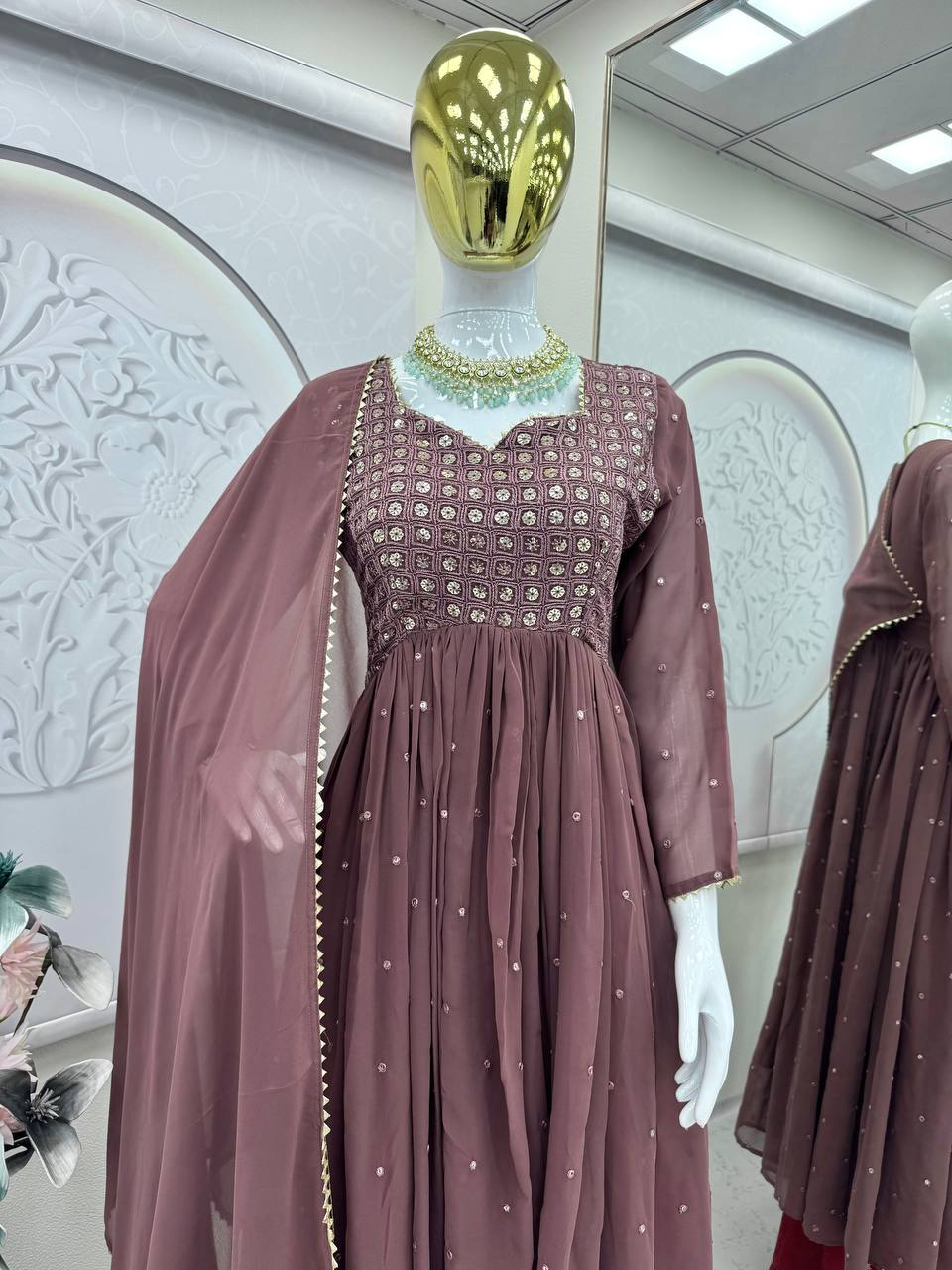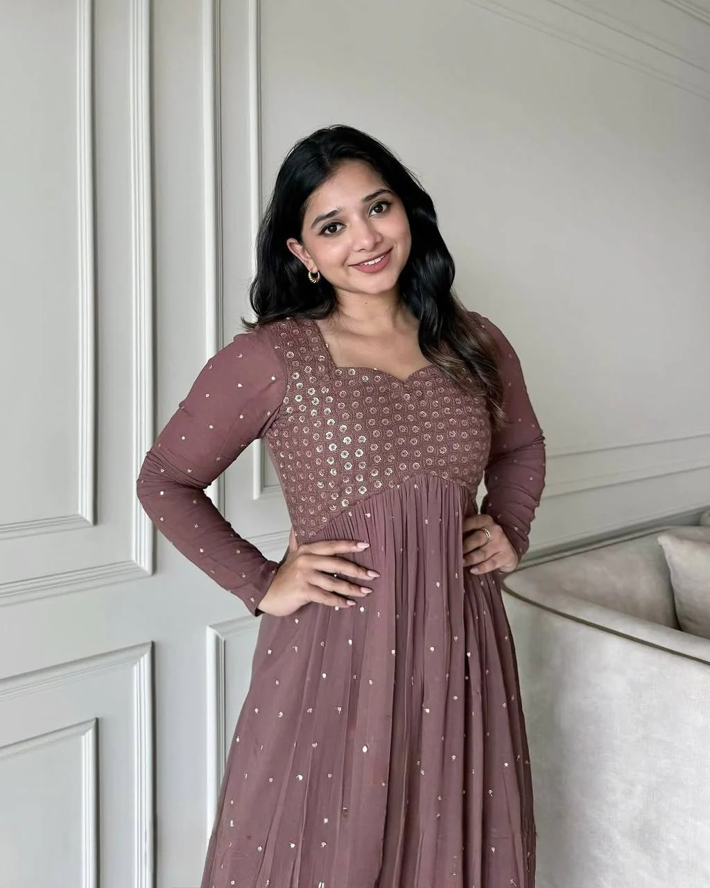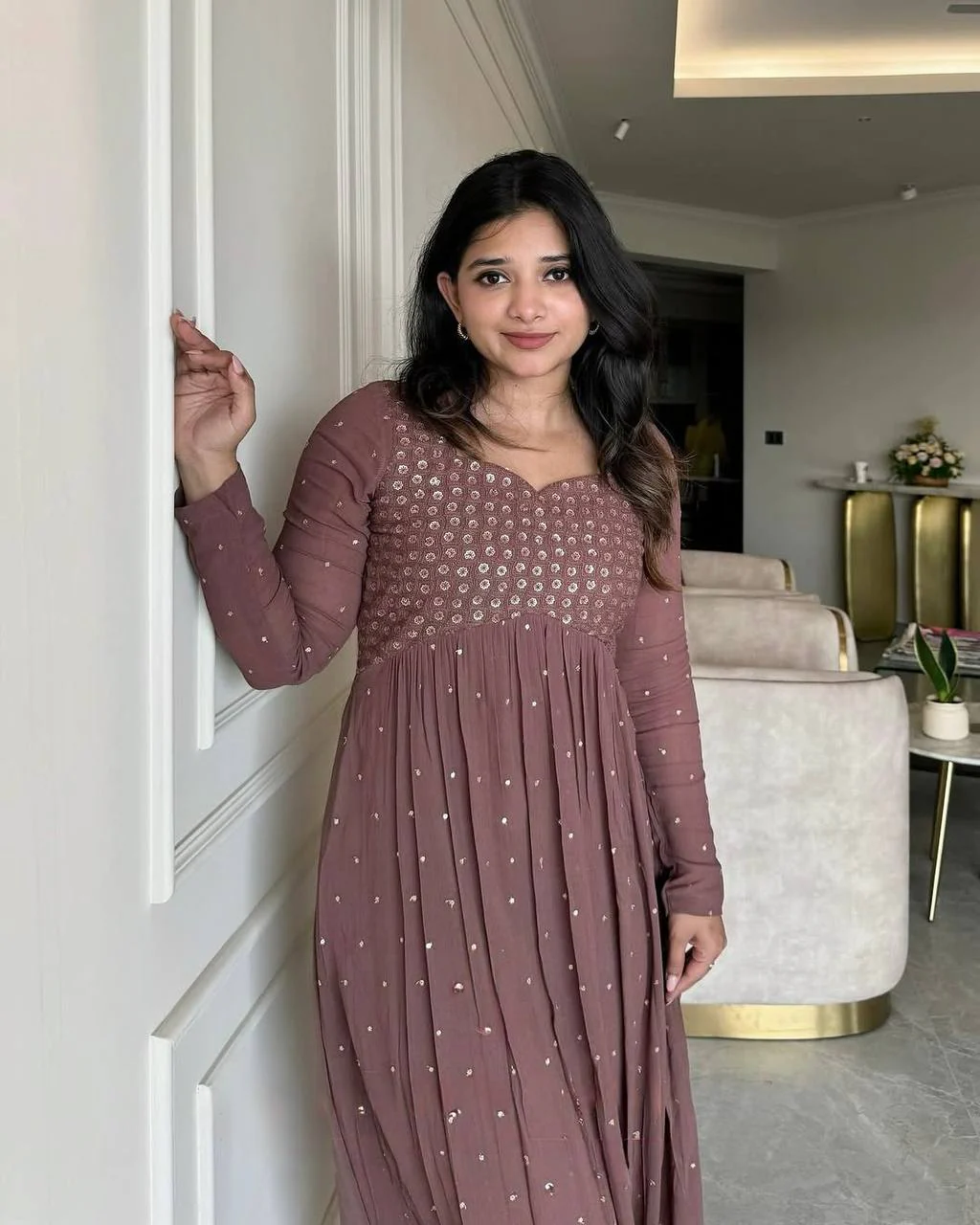 A graceful festive ensemble crafted in heavy faux georgette, featuring elegant sequin embroidery and a stunning 4-meter flare for a flowy, statement silhouette. Designed fully stitched with a soft micro cotton inner for comfort and structure.