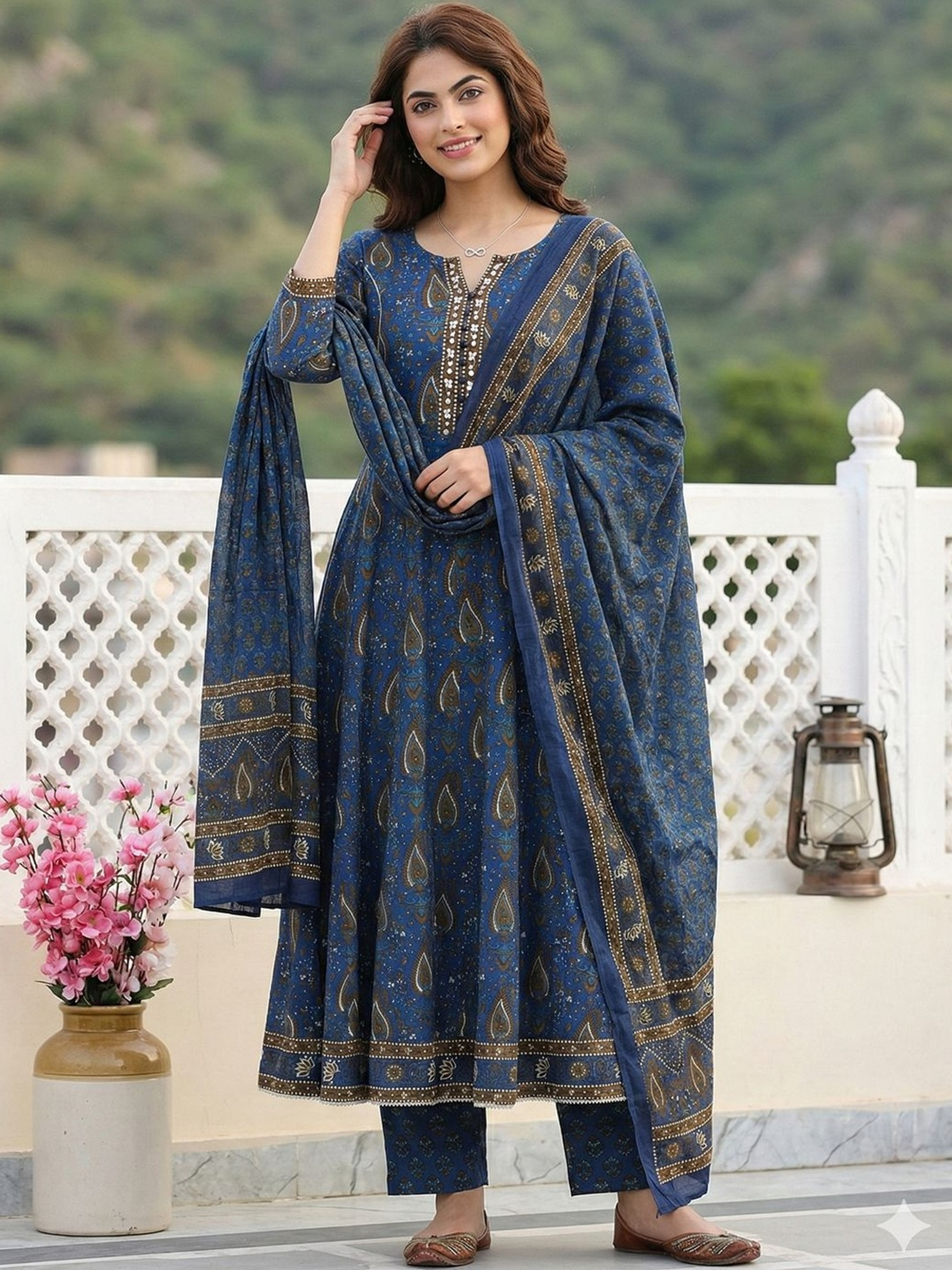 Graceful and comfortable, this Blue Printed Anarkali Kurta Trouser Set is crafted from pure cotton for breathable, all-day wear. Designed for everyday elegance and festive mornings, the set blends traditional prints with an easy, flowy silhouette.