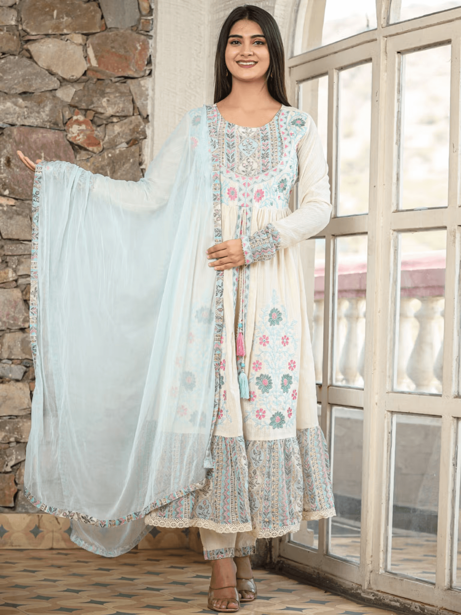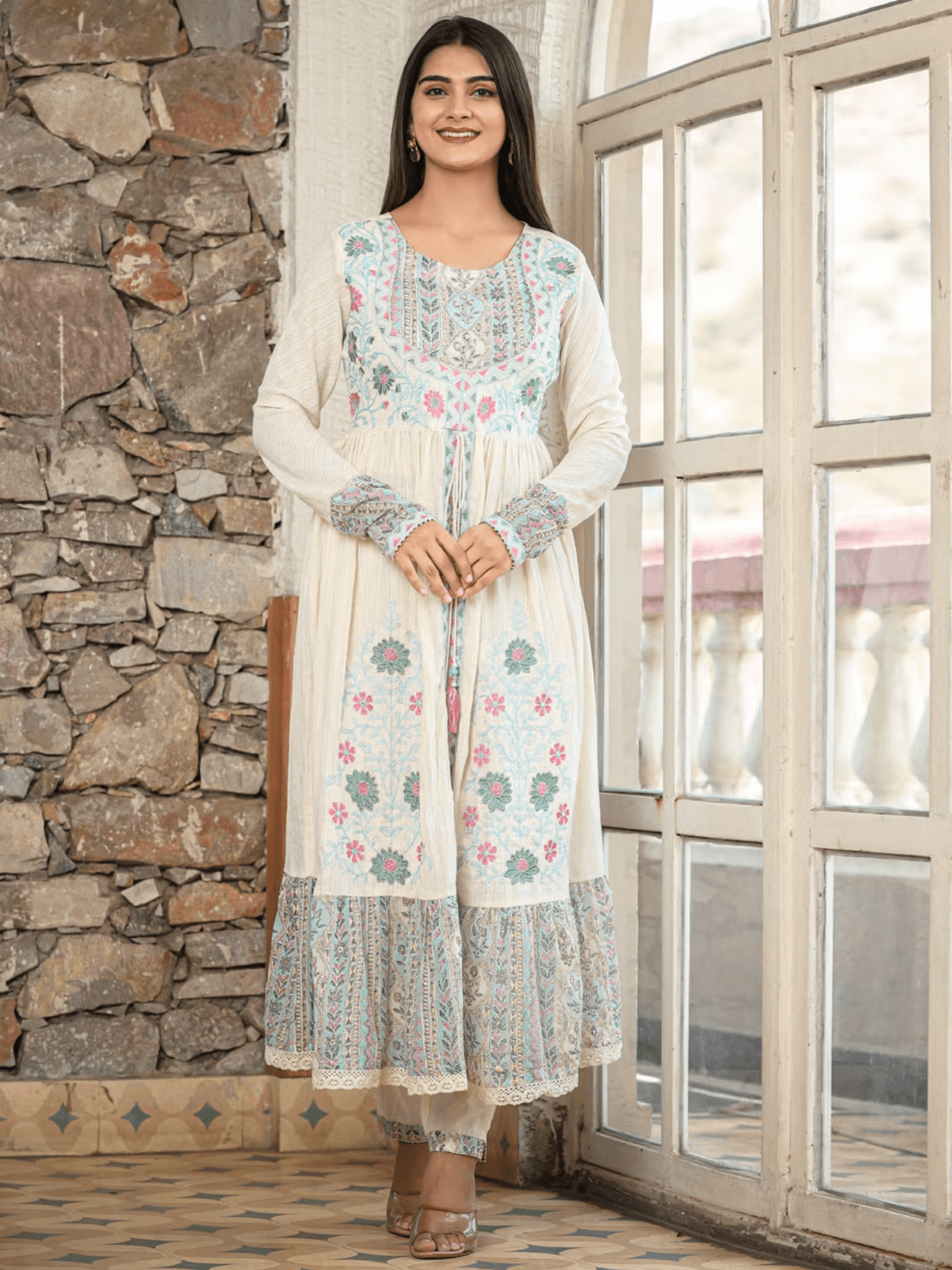 Each element of the floral Anarkali kurta pants set is designed with attention to detail. The vibrant colors and exquisite embroidery make this set a standout piece, ensuring you turn heads wherever you go. Whether paired with traditional jewelry or modern accessories, this outfit guarantees a stylish appearance.