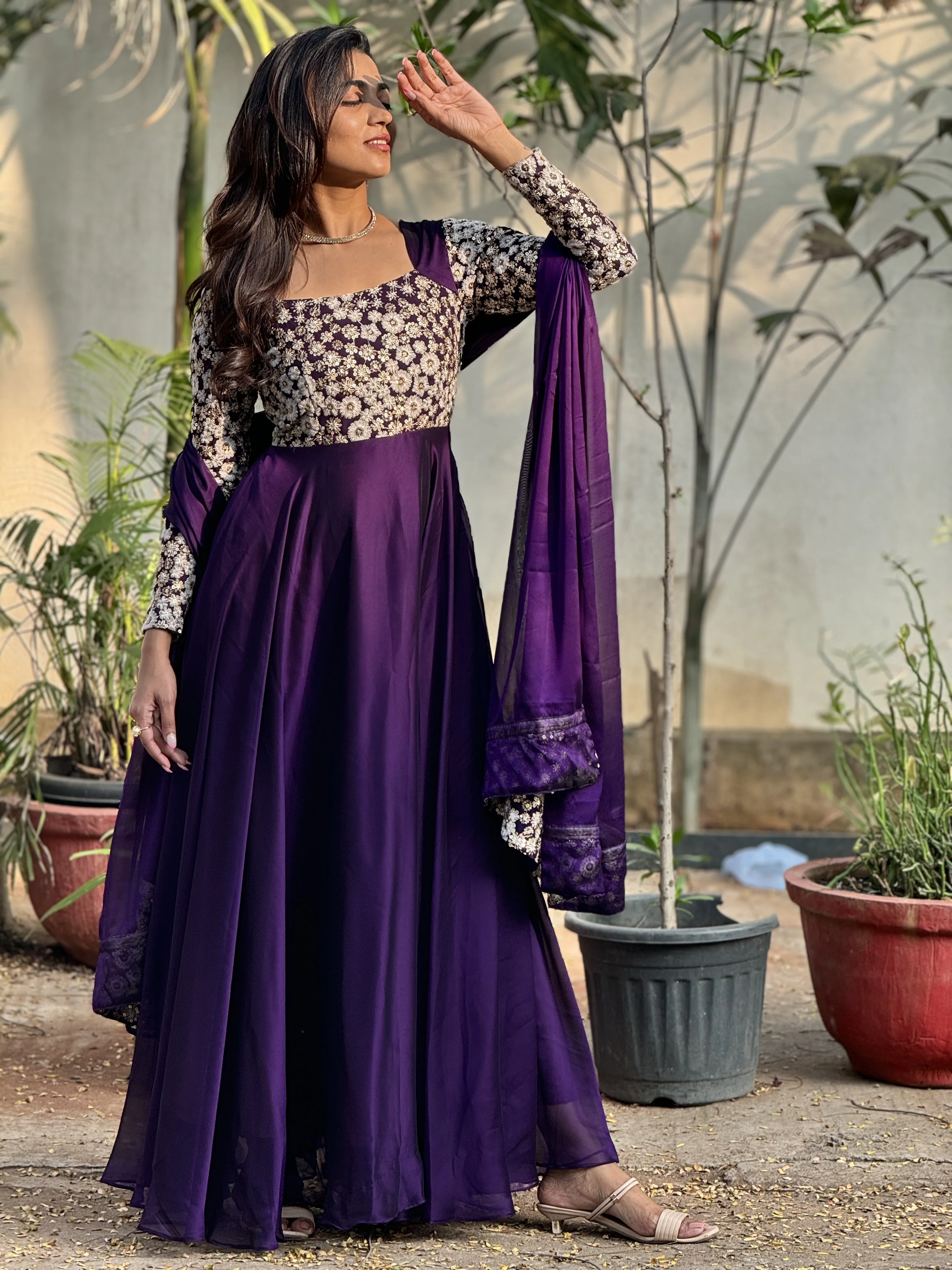 A stunning embroidered georgette gown set designed for grand occasions and effortless elegance