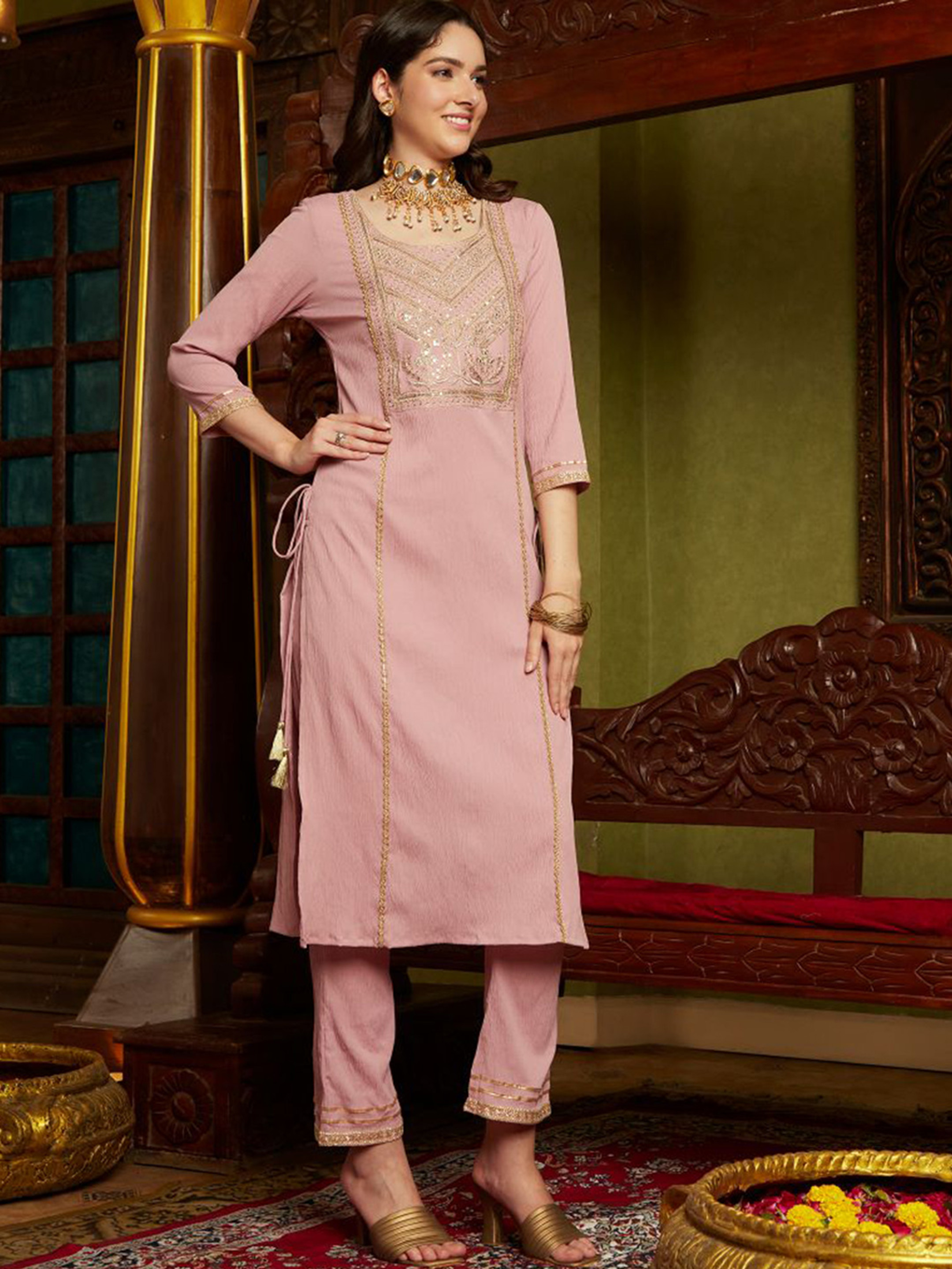 • Kurta: A stunning mauve kurta featuring intricate embroidery, adding a touch of glamour.