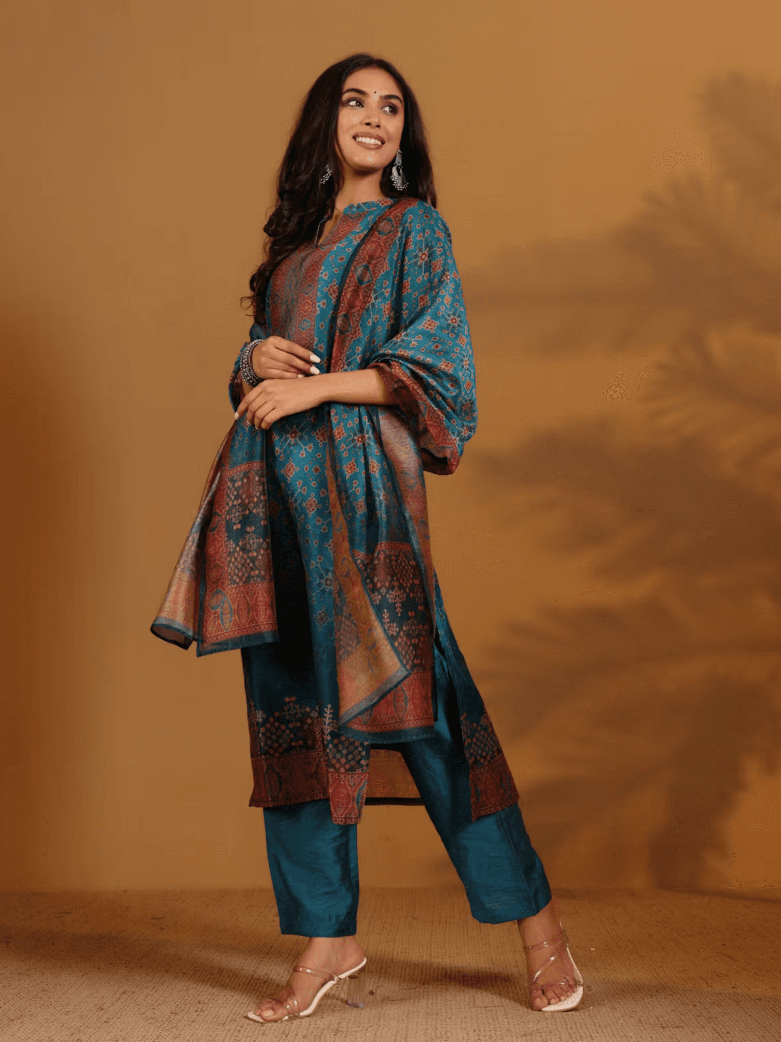 Experience the elegance of the Patola print kurta set Canada with our Women Patola Print Straight Kurta with Pants & Dupatta. This stunning three-piece ensemble features a beautifully designed kurta that adds grace to your wardrobe. The vibrant Patola print reflects traditional artistry, making it perfect for both festive occasions and casual outings.