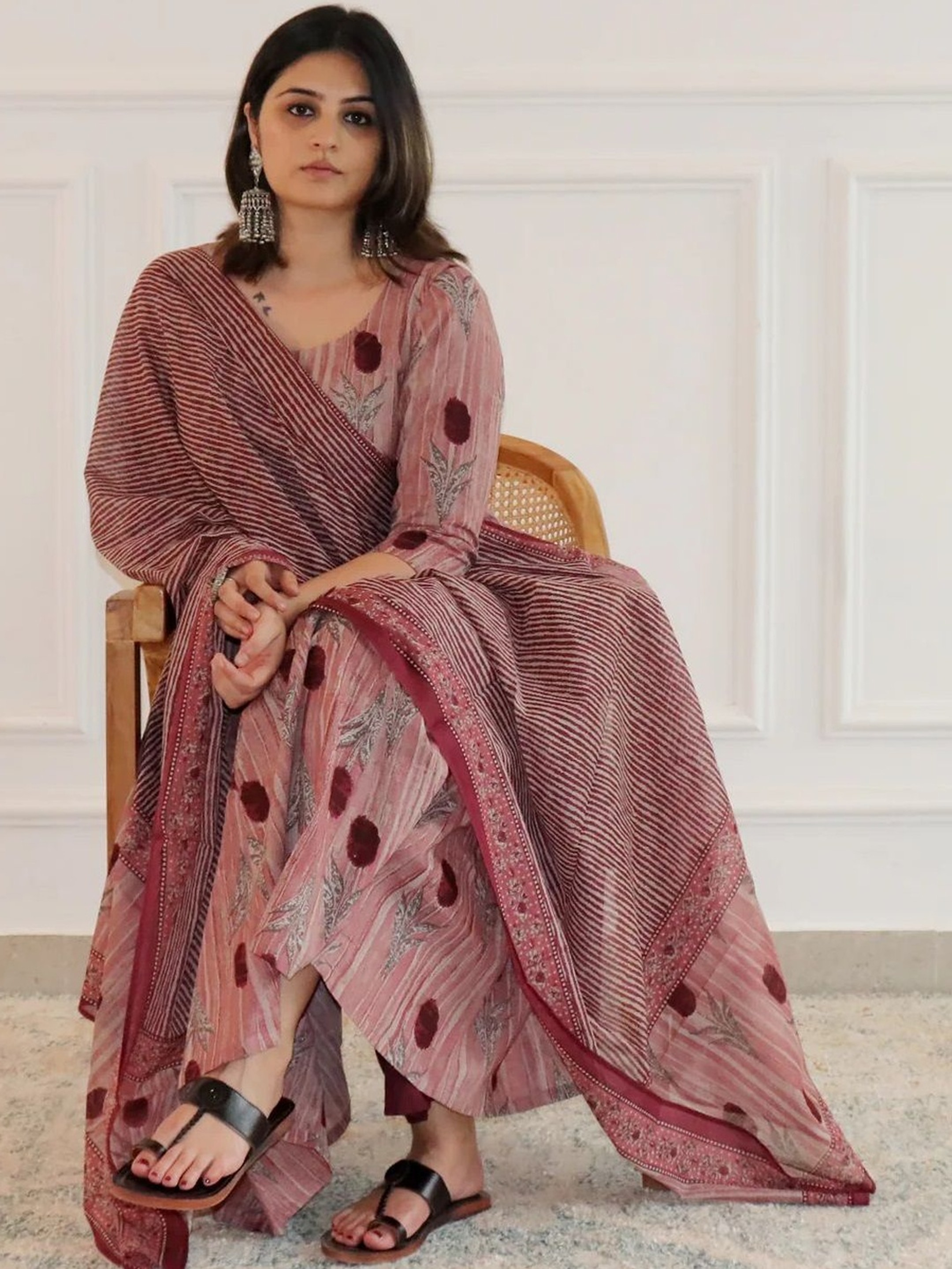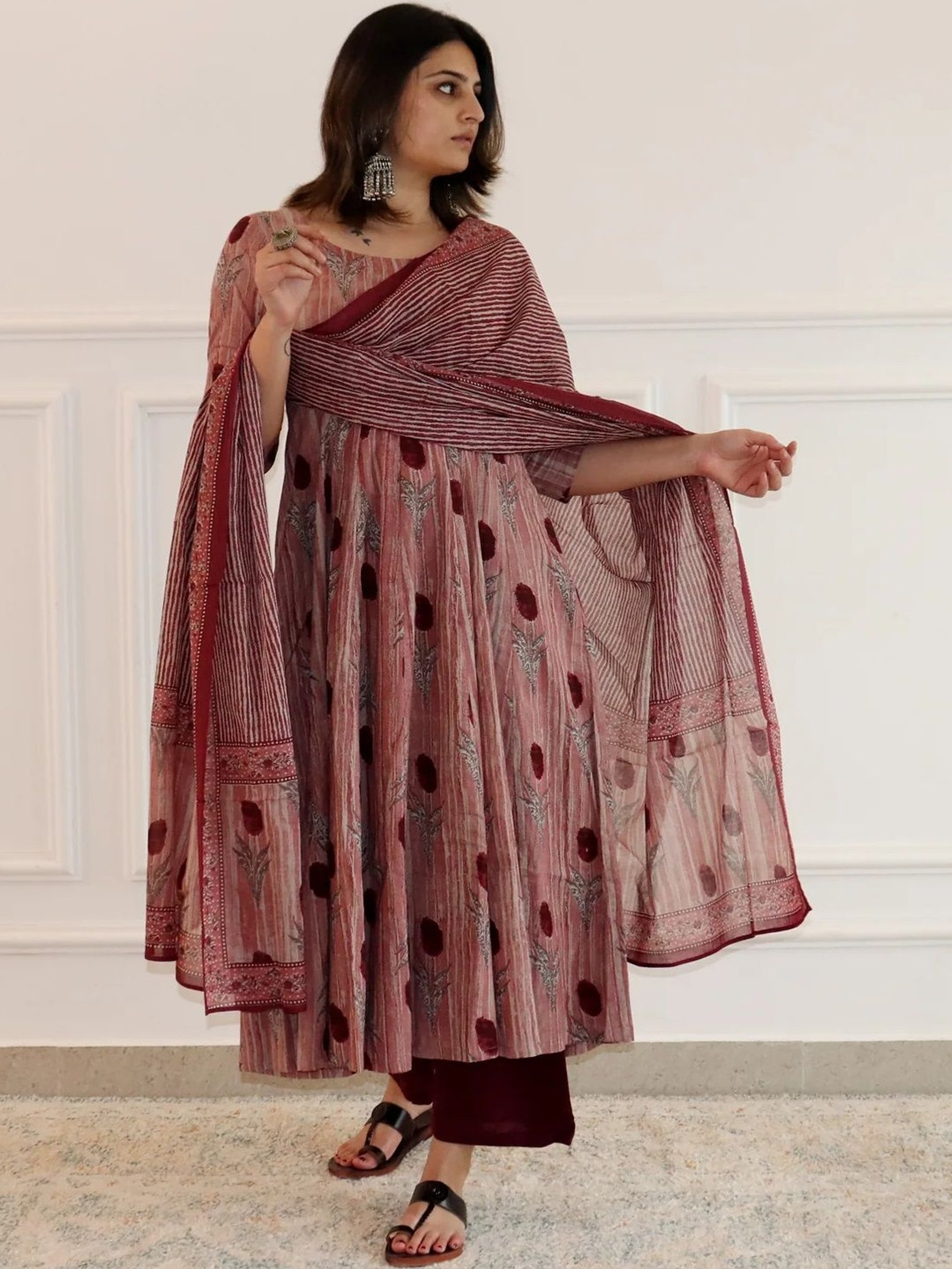 Our pink floral anarkali kurta palazzo set is perfect for festive celebrations or family gatherings. Pair it with statement jewelry and stylish sandals to complete your outfit. Whether you choose to flaunt it during a family function or a casual outing, this set will surely impress.