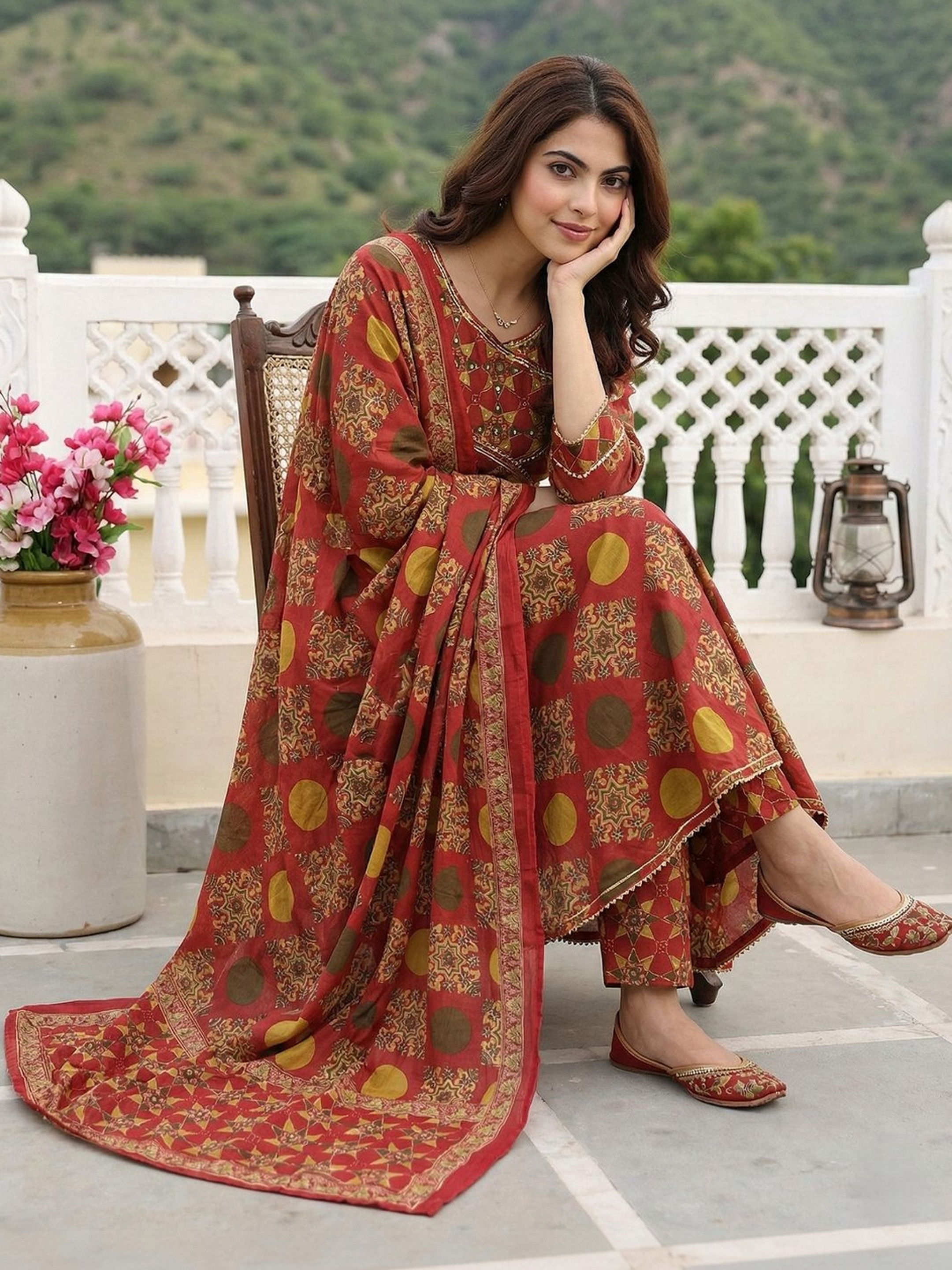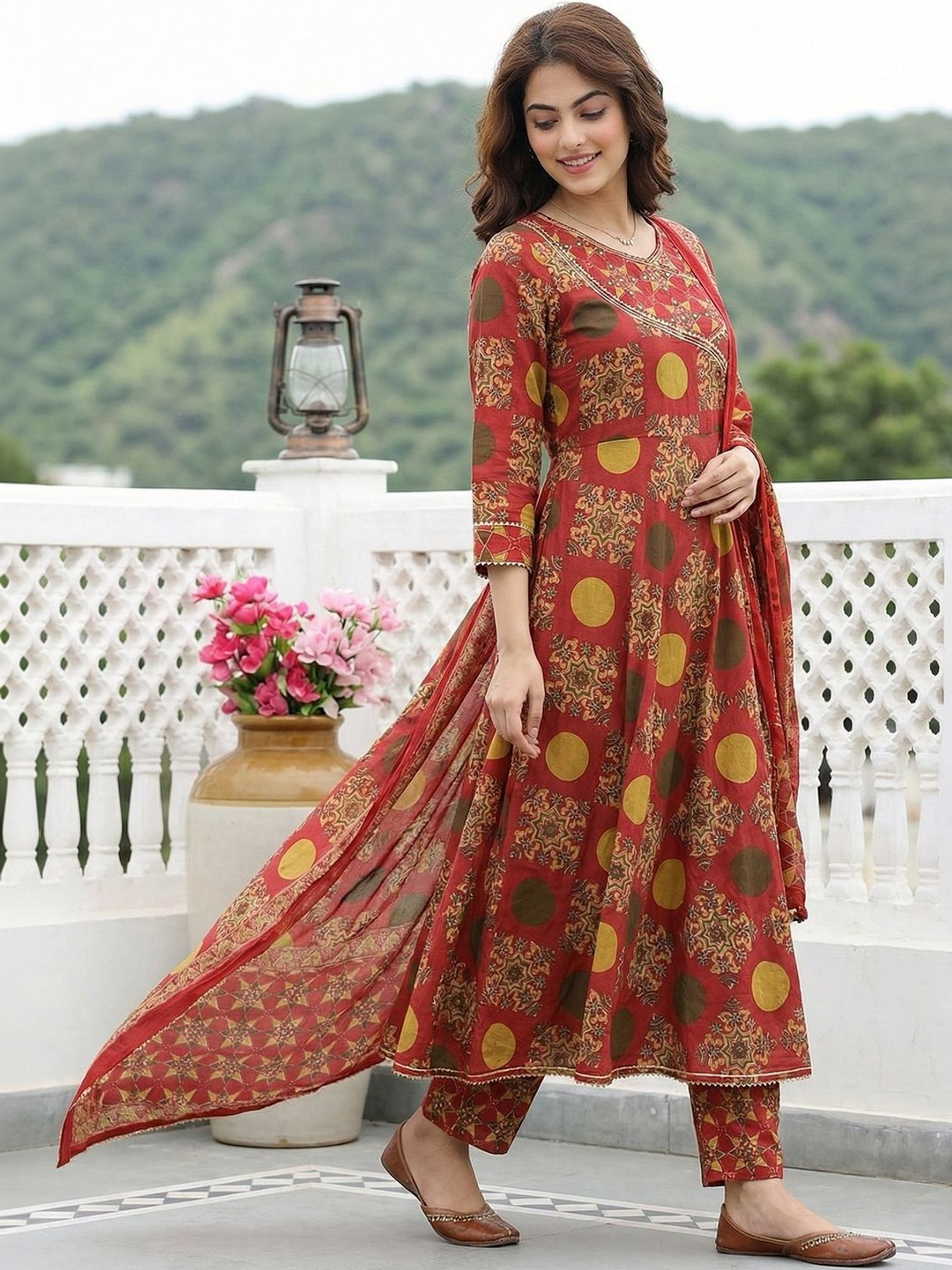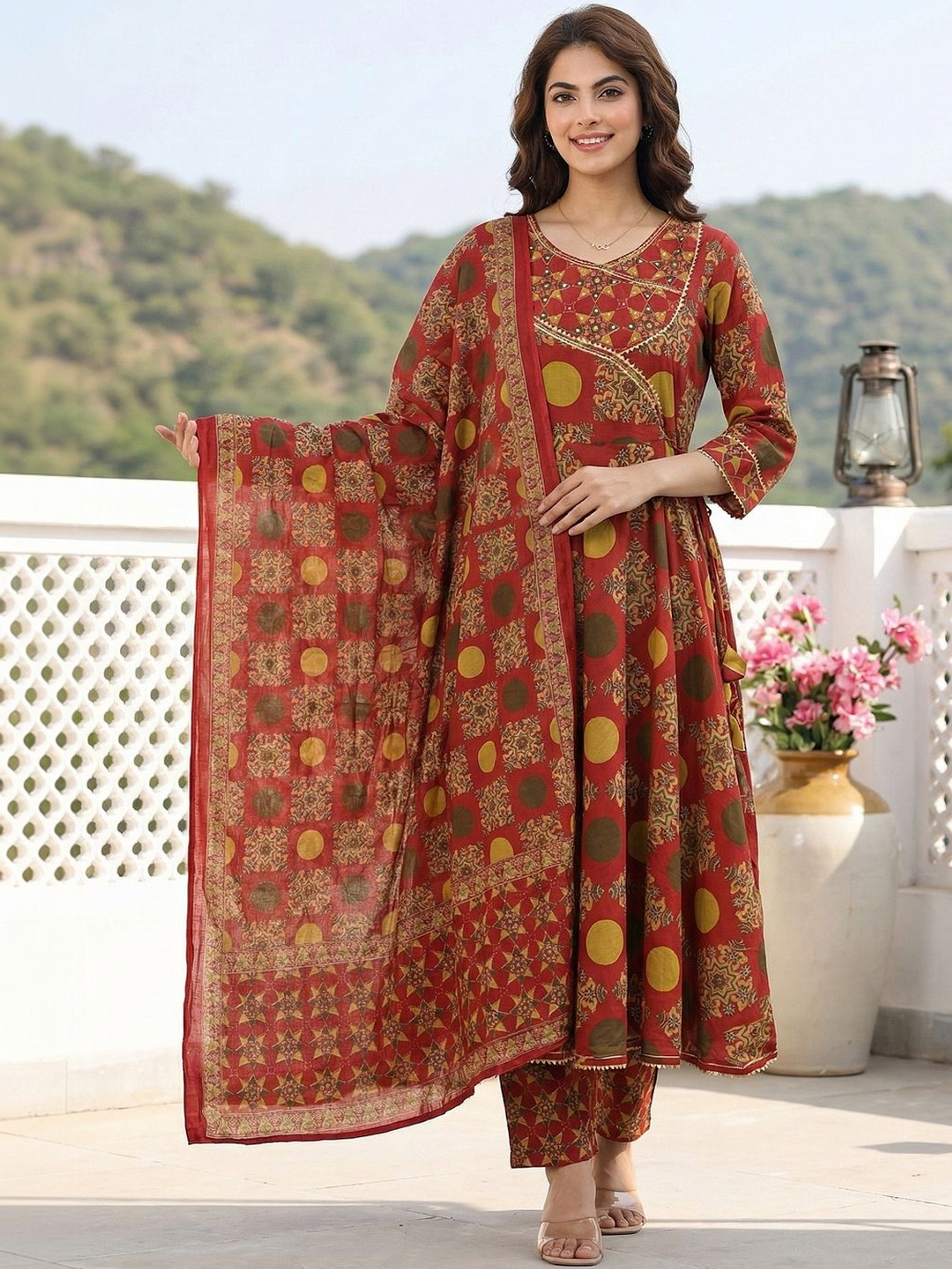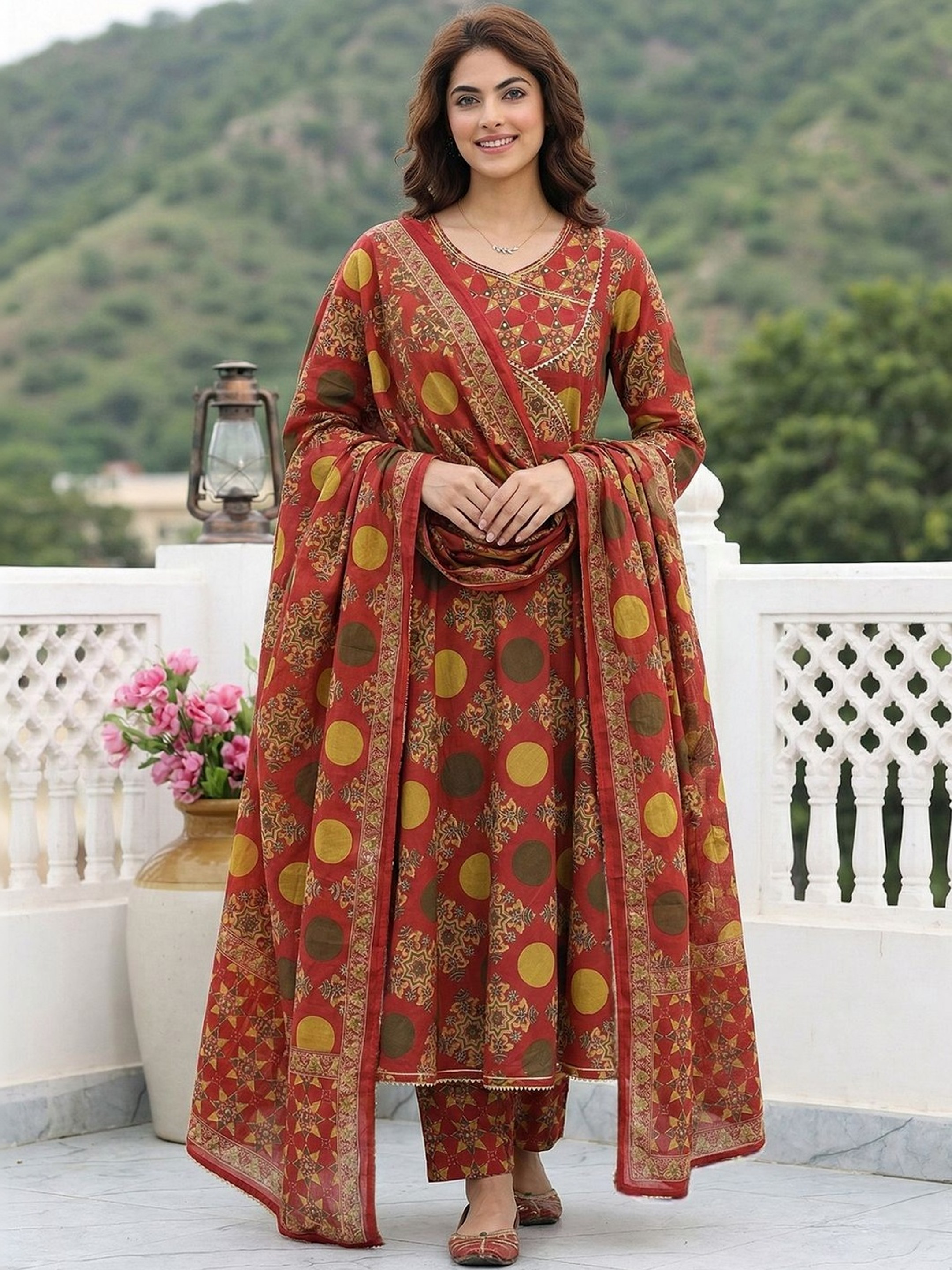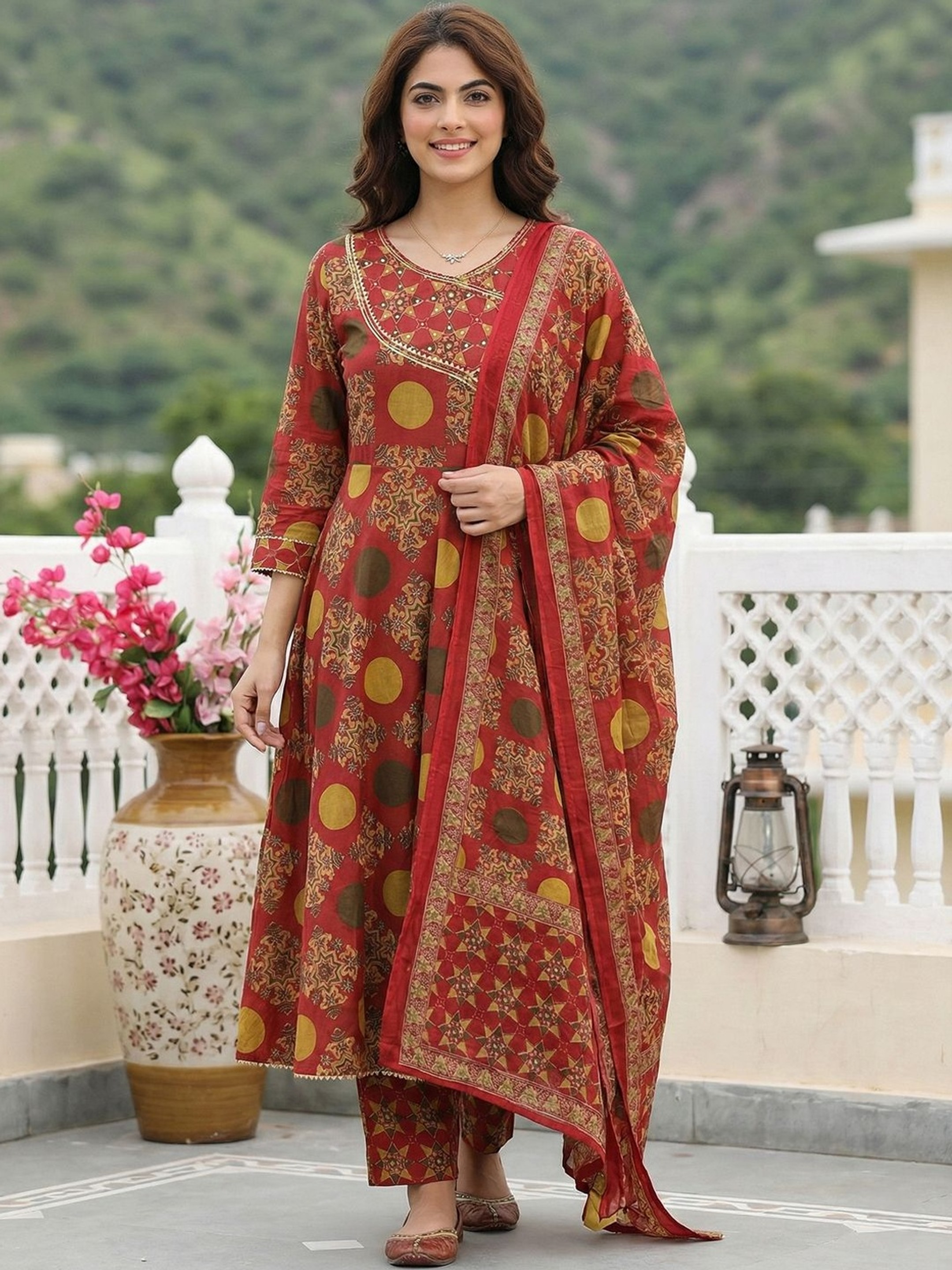Vibrant and full of traditional charm, this Red Printed Anarkali Kurta Trouser Set is crafted from pure cotton for breathable comfort and effortless everyday wear. Designed in a classic Angrakha style, the ensemble blends heritage aesthetics with a graceful silhouette.