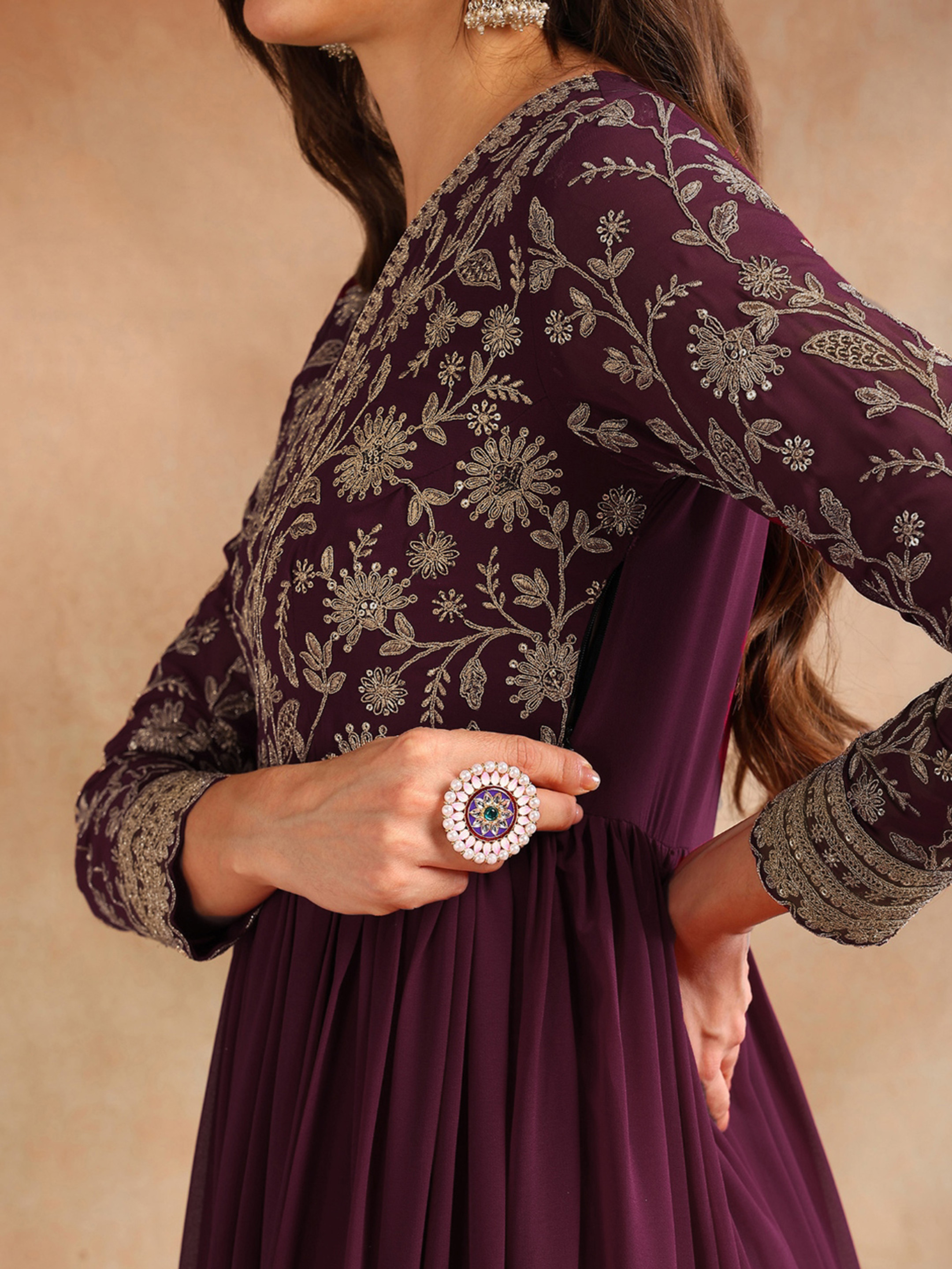 Make a statement at your next celebration with this exquisite purple and gold ethnic gown, featuring intricate floral embroidery that catches the light beautifully. The sophisticated gown silhouette showcases a graceful V-neckline and flowing long sleeves, while the flared maxi hem creates an effortlessly elegant movement. Designed with a comfortable lining and slip-on closure for easy wear, this ready-to-wear piece pairs perfectly with the included dupatta. Crafted from luxurious georgette fabric that's machine washable, it's the ideal choice for festive occasions and special events. Note that colors may vary slightly depending on screen resolution and lighting.