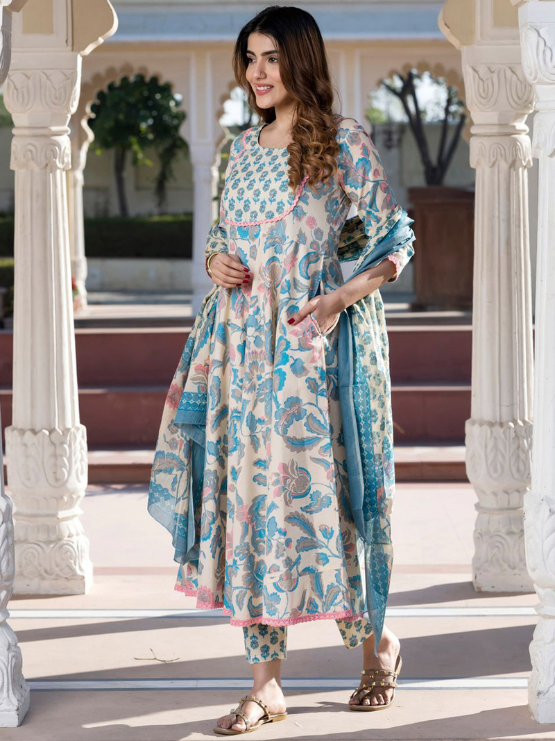Cream Floral Printed Cotton Anarkali Kurta Set with Trousers & Dupatta