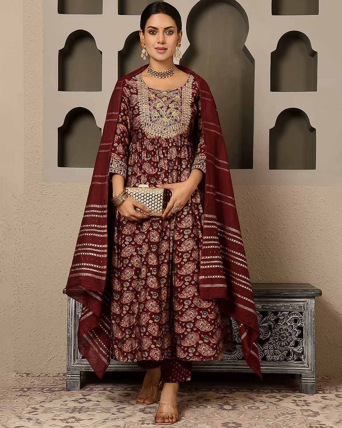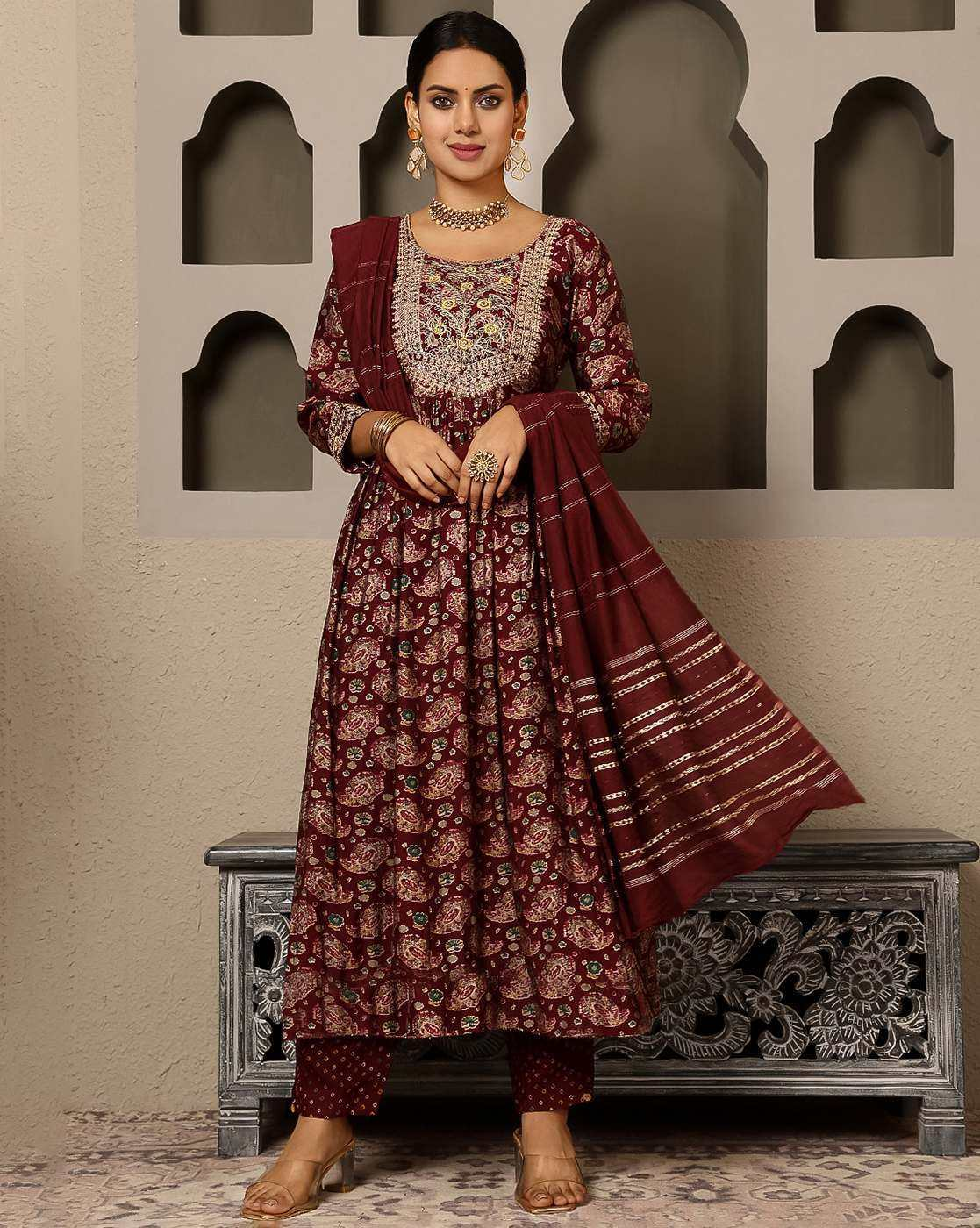 This Printed Rayon Calf-Length Straight Kurta Suit Set offers comfort with elegant style. The set includes a kurta, pants, and matching dupatta for a complete look. This design blends rich prints with intricate details. Gentle rayon fabric makes it perfect for daily wear. People seeking a cotton embroidered kurta set Canada will appreciate the comfortable material and traditional patterns found in this suit set.