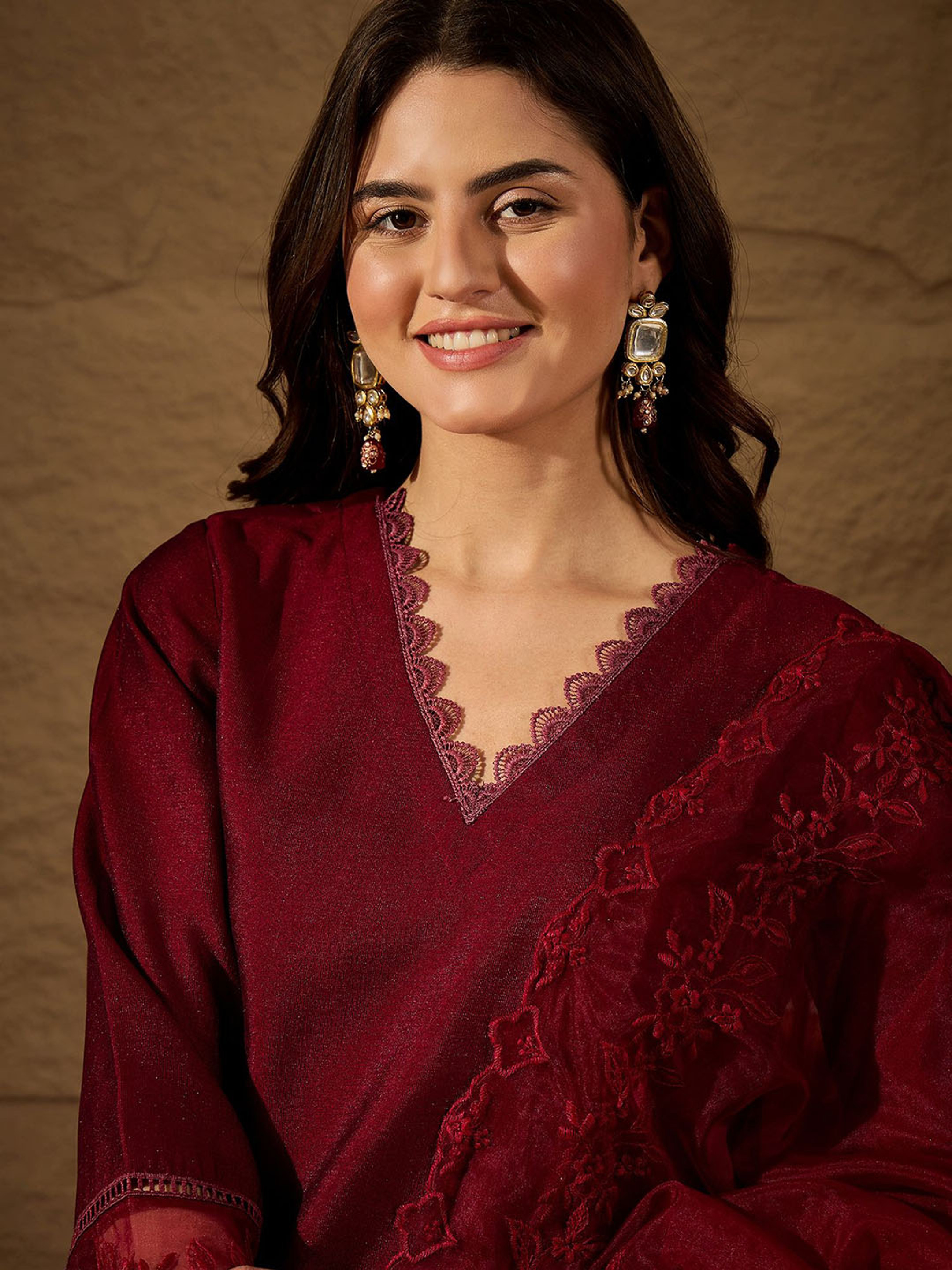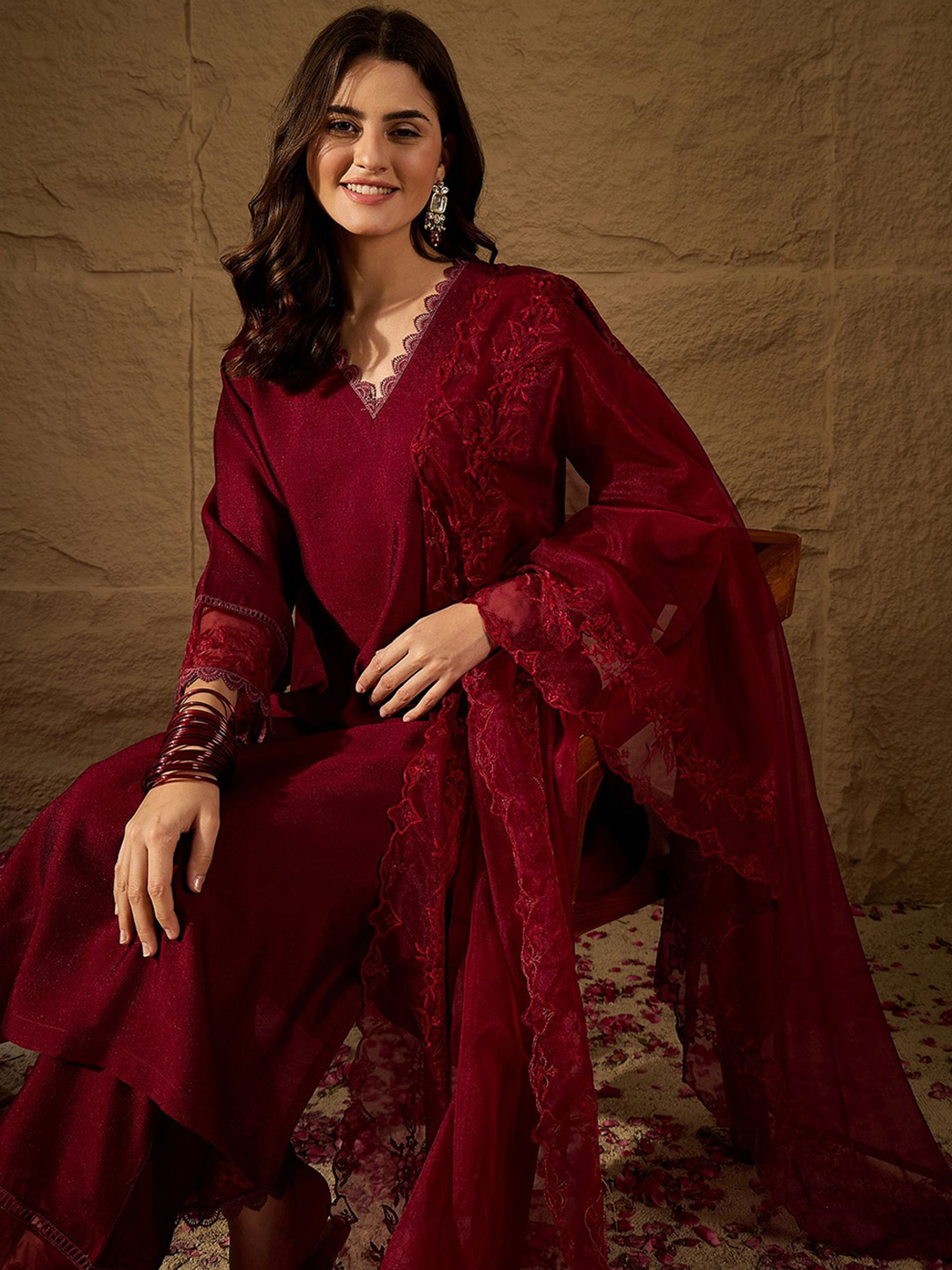 Crafted from high-quality rayon, this kurta set features intricate embroidery that elevates its charm. The rich color and delicate design make it suitable for both casual outings and festive occasions. Paired with matching trousers, it offers a flattering silhouette that is versatile and chic.